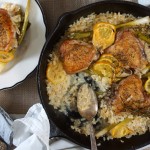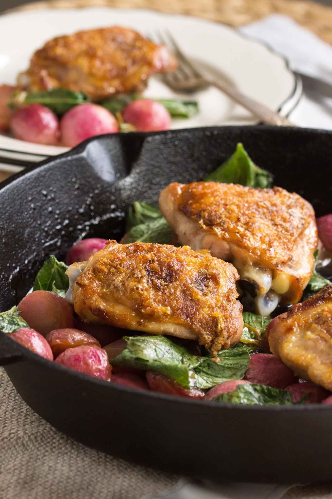 This dinner is a 1-skillet situation. Honey-lacquered chicken thighs are roasted over a bunch of halved radishes. Once roasted, the radishes are tossed with the green radish tops and finished it with a squirt of lemon. Eaten on a damp, chilly night, this had a lightened up comfort food quality that was just right for a rainy spring dinner.