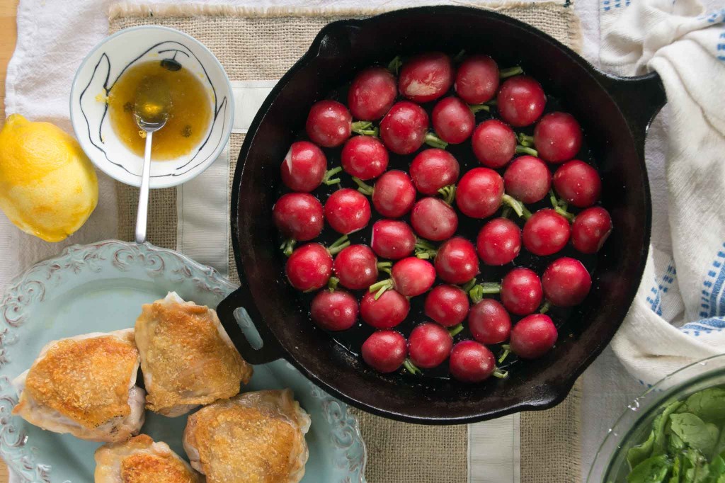 The grocery list for this one is short–just a few chicken thighs, a couple of bunches of radishes, a lemon, and I’ll bet you’ve already got the honey.