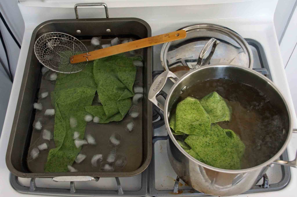 4. Now prepare to cook the pasta. Salt the boiling water and prepare a large ice bath to shock the pasta after it has cooked. I use a large roasting pan set over 2 burners of my stove so it is nearby and transferring the pasta is easy. You’ll also need another baking sheet and more clean kitchen towels (sorry, the laundry is piling up almost as fast as the dishes!) for the cooked pasta. Cook the pasta, 1 or 2 pieces at a time, by slowly lowering each piece into the boiling water. As you lower it in, the water will take over and grab it from you. Cook the pasta until it floats up to the top and appears evenly cooked, about 1 minute. Gently remove, letting the hot water drain off, and place in the ice bath to stop it from cooking any farther. As soon as the pasta has cooled, pull it out of the ice water, let the water drain off, and transfer to a clean towel. Repeat until all of the pasta has been cooked. You’ll find a rhythm in the process and it will not take very long at all (promise!).
