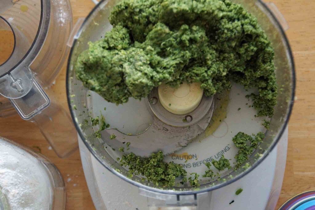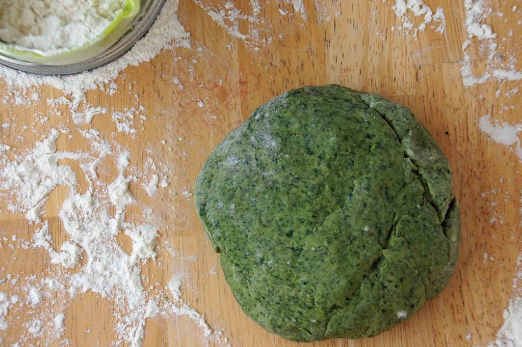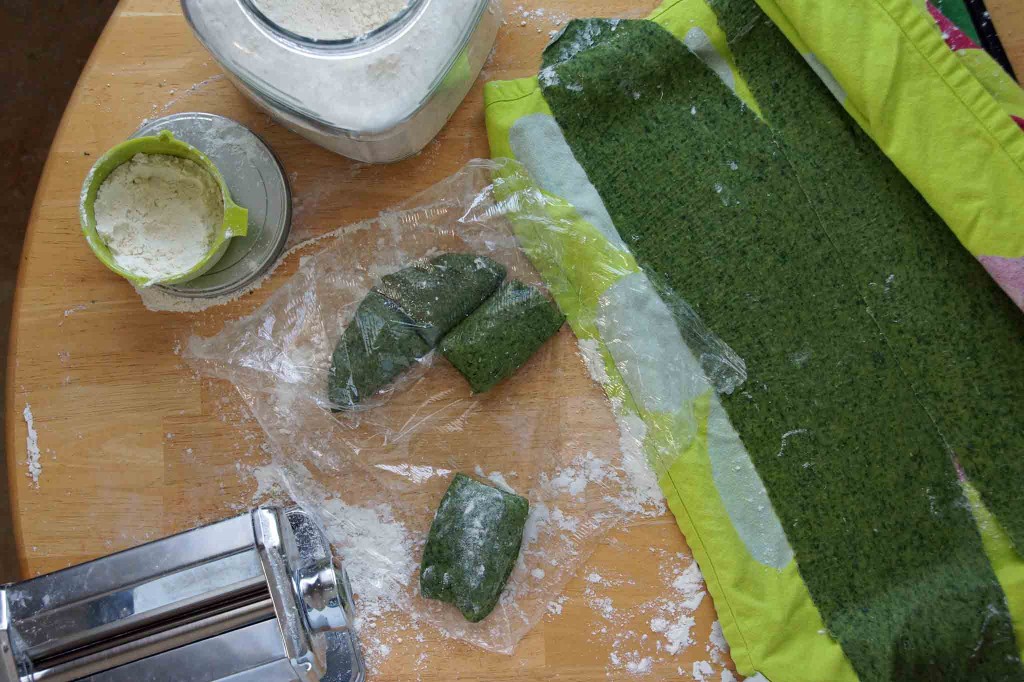 1. First, we’ll make the pasta dough. Squeeze the thawed spinach to remove as much liquid as possible. When you are convinced it can’t get any drier, place the spinach in the bowl of a food processor. Pulse until the spinach is finely chopped. Add 2 c. flour and pulse to combine. Whisk together the eggs, egg yolks, and olive oil in a liquid measuring cup. With the food processor running, slowly pour the egg mixture into the flour and process for 30 seconds. Scrap down the sides and the bottom of the bowl and continue to process until a rough ball of dough forms on the blade. Transfer the ball of dough to a floured board or countertop and knead briefly until it feels smooth and elastic. Wrap tightly in plastic wrap and allow to rest at room temperature for at least 30 minutes before rolling.