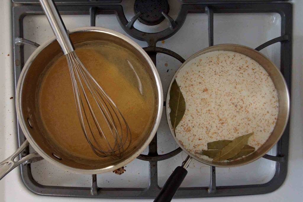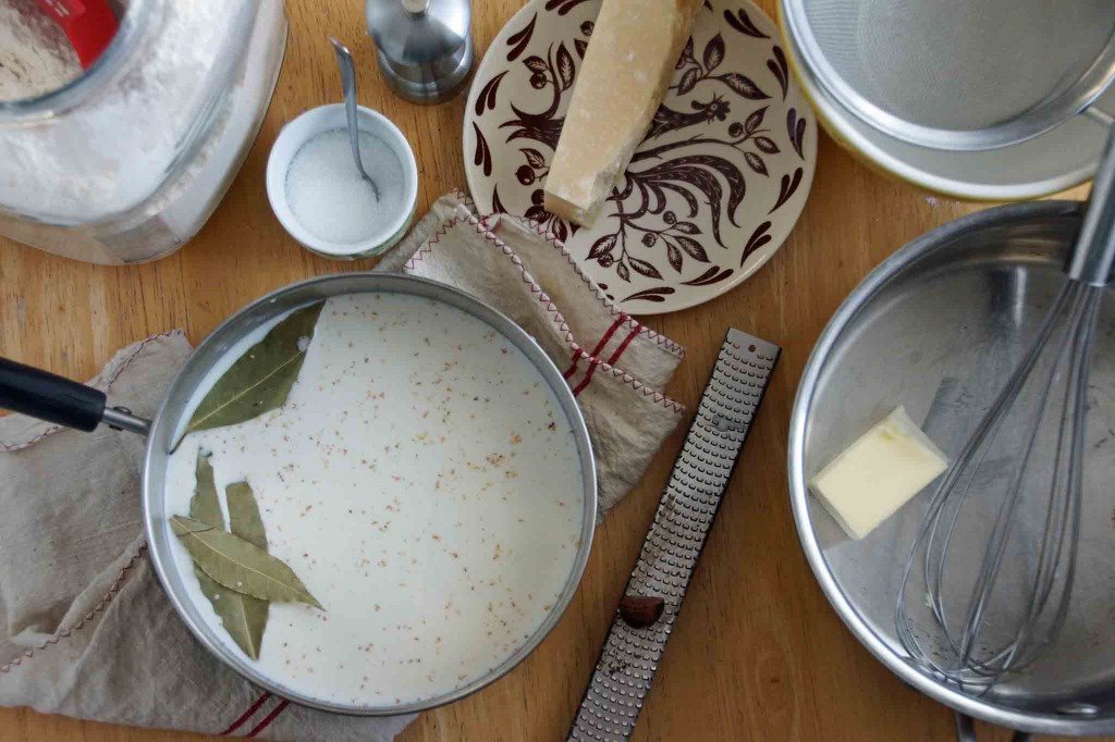 Heat the milk with the bay leaves and nutmeg in one pan while you make a roux with the flour and butter in another pan.  Whisk the hot milk into the roux and cook until the mixture thickens.  Strain, stir in the parm, adjust the seasoning, and set it aside while we roll out the pasta.  We are making serious progress!