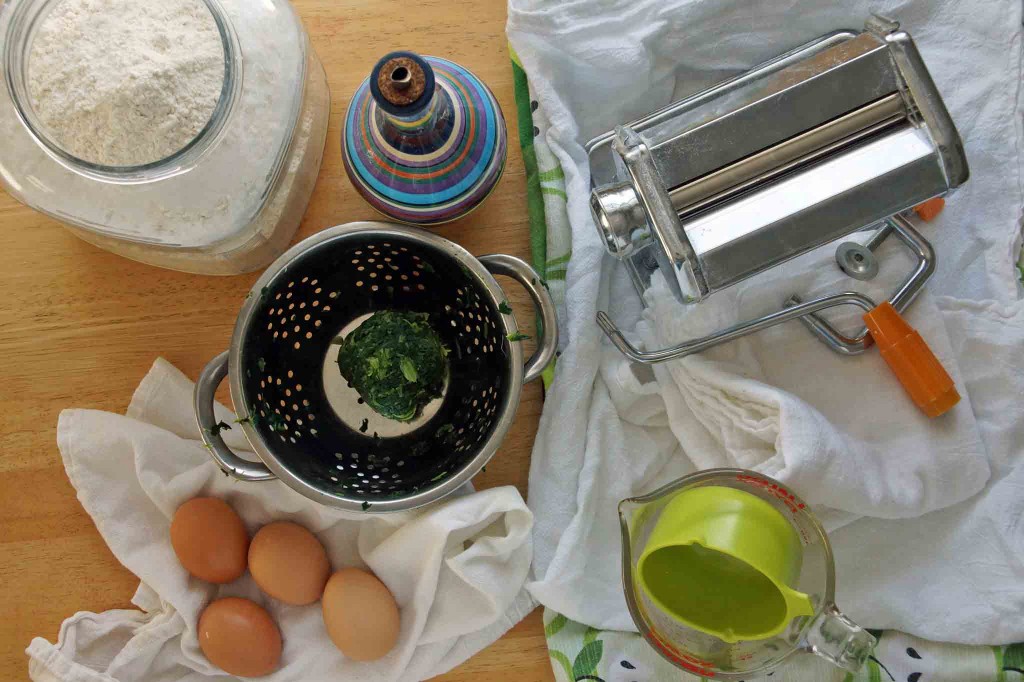 For the pasta, you’ll need a block of frozen spinach, flour, eggs, and olive oil.  Thaw the spinach and wring it out until you think it can’t possibly get any drier.