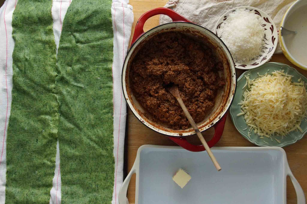 Rolling out Pasta Sheets Boiling Lasagna NoodlesTime to put it all together!  Find yourself a clear surface and set out all of the components you’ve labored over: the cooked pasta sheets, Bolognese sauce, and  béchamel.  Grate a heap of cheese that will melt well (I like Fontina) and a pile of Parmesan.  Butter a baking dish and start building your lasagna.