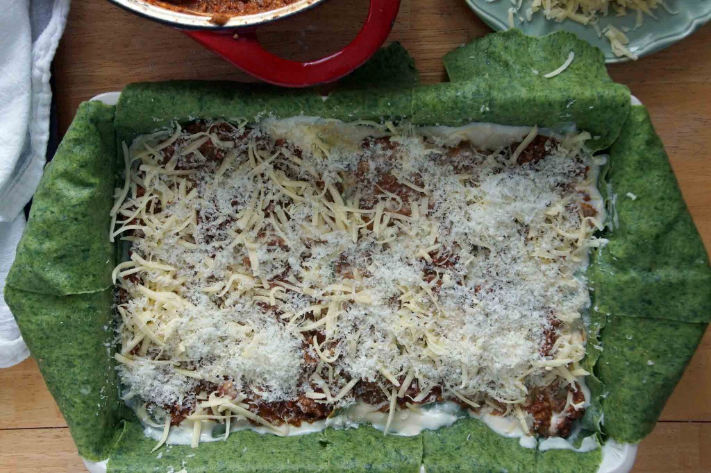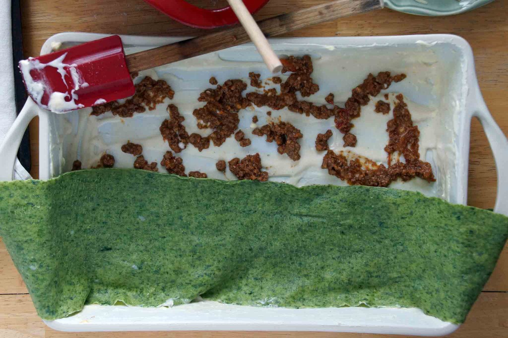 Lasagna AssemblySmear a bit of béchamel on the bottom of the pan and top with a little of the Bolognese.  This will anchor the lasagna and keep the bottom layer of pasta from drying out.  Now cover the bottom with sheets of pasta, letting a few inches hang over the sides.  Smear with thin layer of béchamel, top with a bit of Bolognese, sprinkle with cheese.  Repeat.  Rather than thinking of the sauces as “filling”, I choose to think of them as the adhesive that holds the noodles together–remember how hard we worked on the pasta?  The pasta is every bit as important as the sauces and cheese–we don’t want it getting lost in the shuffle.
