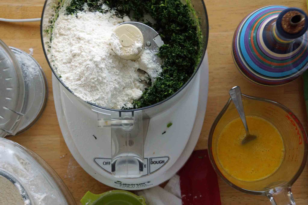 Ingredients for Spinach PastaPop the spinach in the food processor and chop it as finely as you can.  Since we’ve already made a mess of the food processor, we may as well make our dough in it, as well.  Add flour to the spinach and combine, then, with the motor running, slowly pour in the eggs and olive oil and process until a rough ball of dough starts to form on the blade.  Dump it out, knead until smooth.  Now wrap it in plastic and let it rest while you make the béchamel sauce.