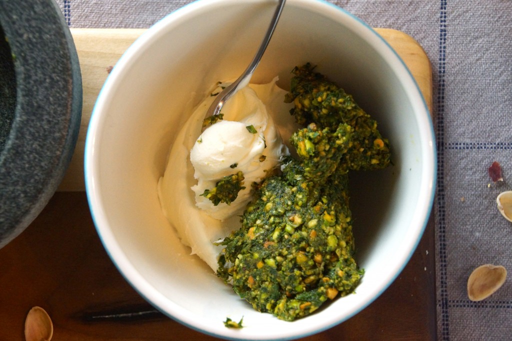 Mint, Basil & Pistachio PestoMix the greenery with Mascarpone.  Add a squeeze of lemon, season with salt & pepper.