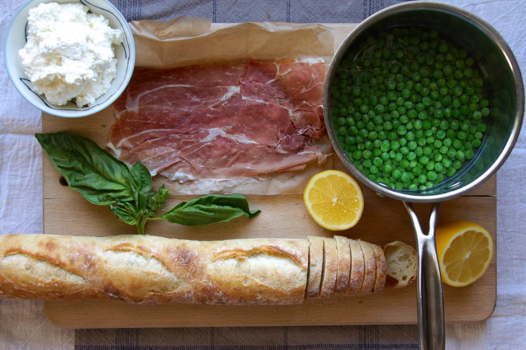 Let’s make some crostini. Grab your ingredients: fresh, creamy ricotta cheese, thinly sliced prosciutto, plenty of peas, basil, lemon, and a baguette.