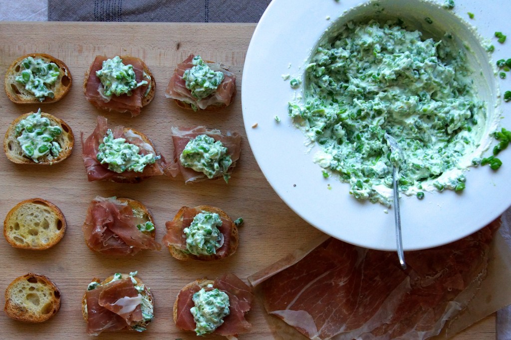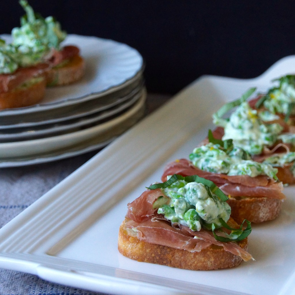 - Assemble the crostini. Spread a very small amount of the ricotta-pea mash on the each crostini. This will serve as the "glue" to hold the prosciutto in place. Take about a ¼ of a slice of prosciutto and drape it over the top of the crostini. Spoon a heaping tsp. of the ricotta-pea mash on top of the prosciutto. Sprinkle with additional basil and lemon zest.