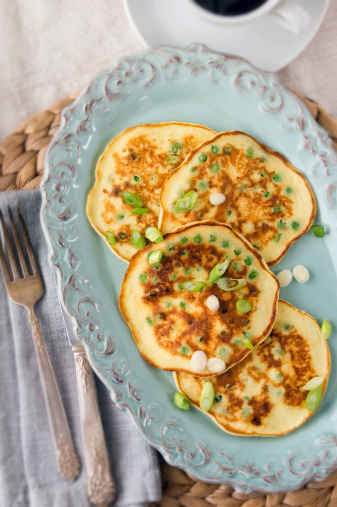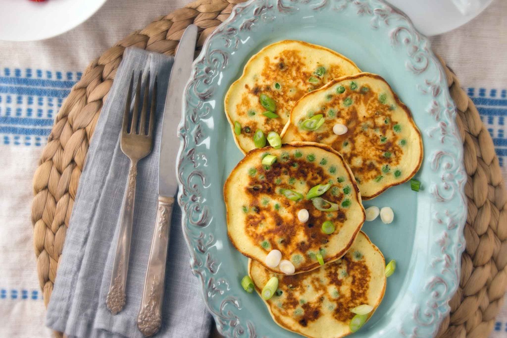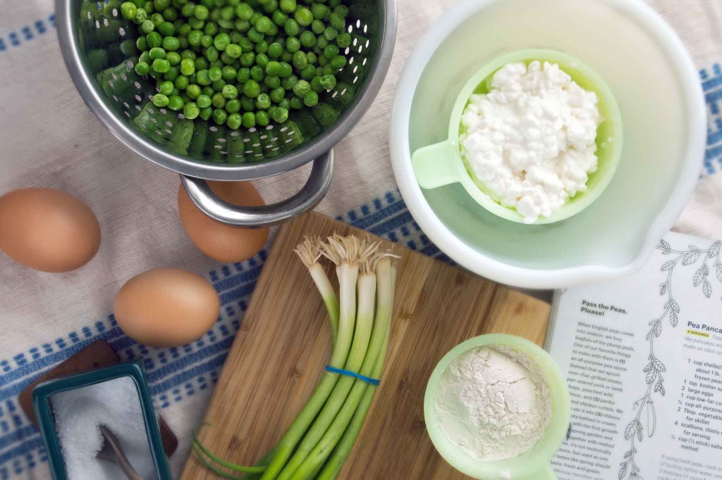 These pancakes get most of their substance from cottage cheese and eggs which, together, yield a very tender, flavorful pancake. To make the batter, just buzz cottage cheese and eggs with a pinch of salt and a little flour until smooth. Stir in plenty of green pea and a few sliced scallions.