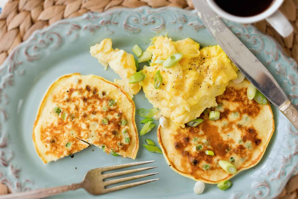 - Place a non-stick griddle over medium heat and melt a little pat of butter. Once the griddle is hot, pour out 4 pancakes. Each pancake should be a scant ¼ c. of batter and 3-4 inch across. Cook until the tops begin to bubble, 3-4 minutes. Flip and cook until the other side has browned and the centers are cooked through, another 2-3 minutes. Transfer to a warm plate, sprinkle with a few of the remaining scallions, and serve.