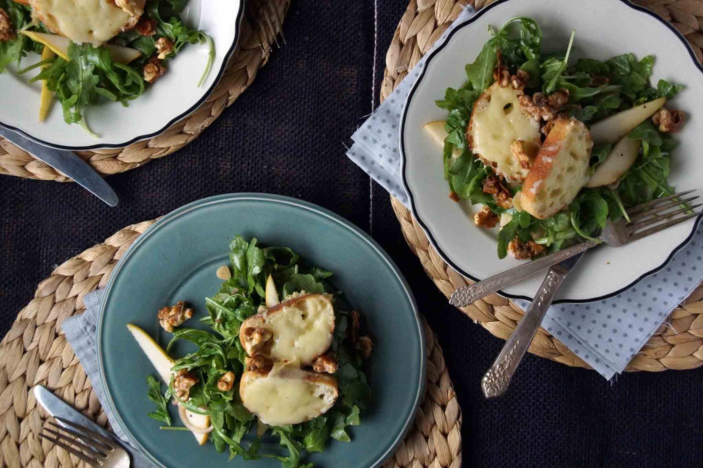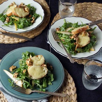 And I’ve got to say, this salad has got it going on! We have greens and pears for our health, candied walnuts for crunch and pizzazz, and melted cheese for creamy decadence.