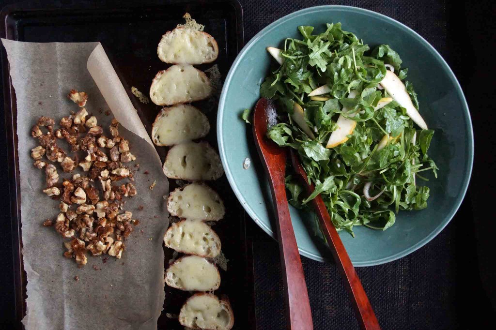 Okay, let’s make a salad. Raid the fridge for greens and that chunk of cheese you’ve been meaning to use up. Grab walnuts from the cupboard, a shallot or onion, sprig of rosemary, and a pear.
