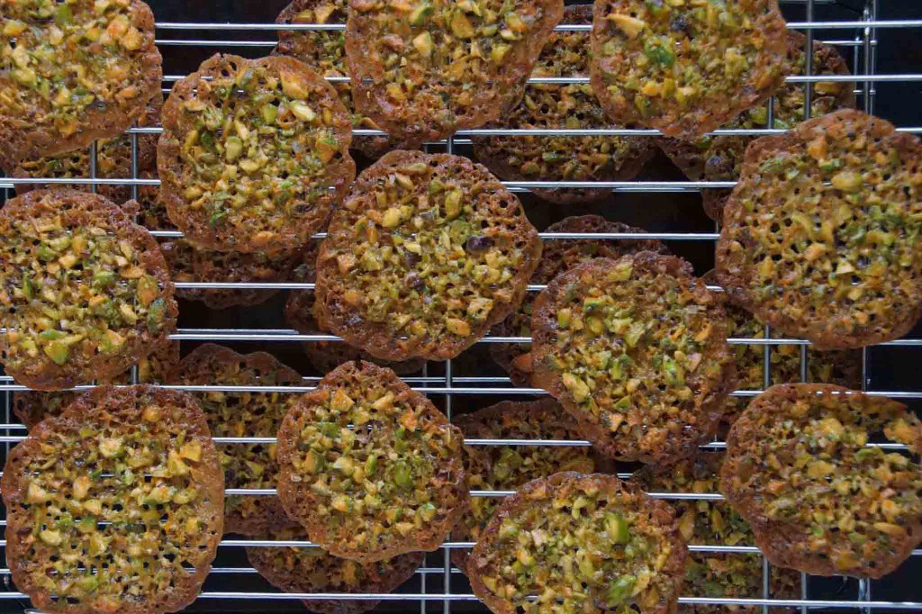 My pistachio florentines are the cookies you’ll probably pass over on your first go-around with the holiday cookie tray. They’re unassuming, thin and brown. No bells, sparkles, or whistles. You’ll skip right over them and make a grab for the little cutie with the sprinkles and frosting.