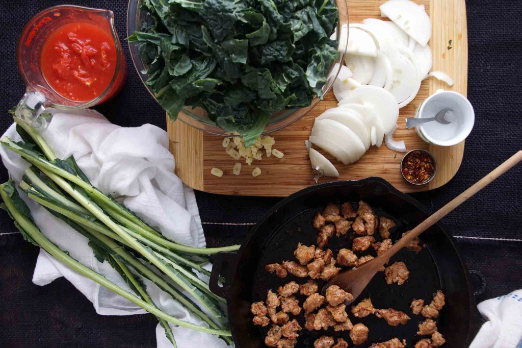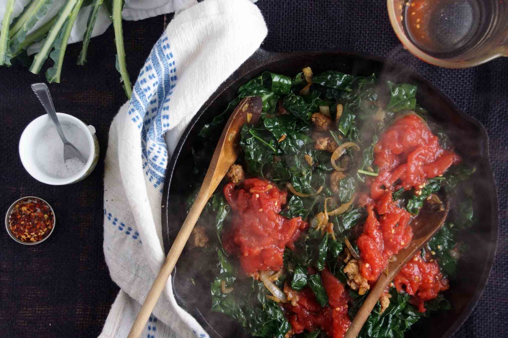 Add the chopped kale to the mix in a few batches. It’ll seem like the kale to sausage ratio is way off at first but as the greens cook down, the combination will even out. Once they’ve settled in to the pan, add the crushed tomatoes and simmer for a few minutes to let the flavors come together.