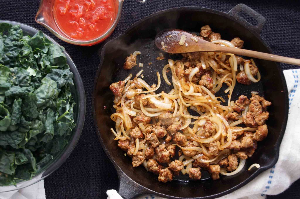 While your polenta is working, start prepping the rest of your ingredients. Slice an onion and a few cloves of garlic. Crush the tomatoes. Remove the tough kale stalks and give the leaves a chop. Pop the sausages out of their casings, break into bite-sized chunks, and brown the sausage in a large skillet.