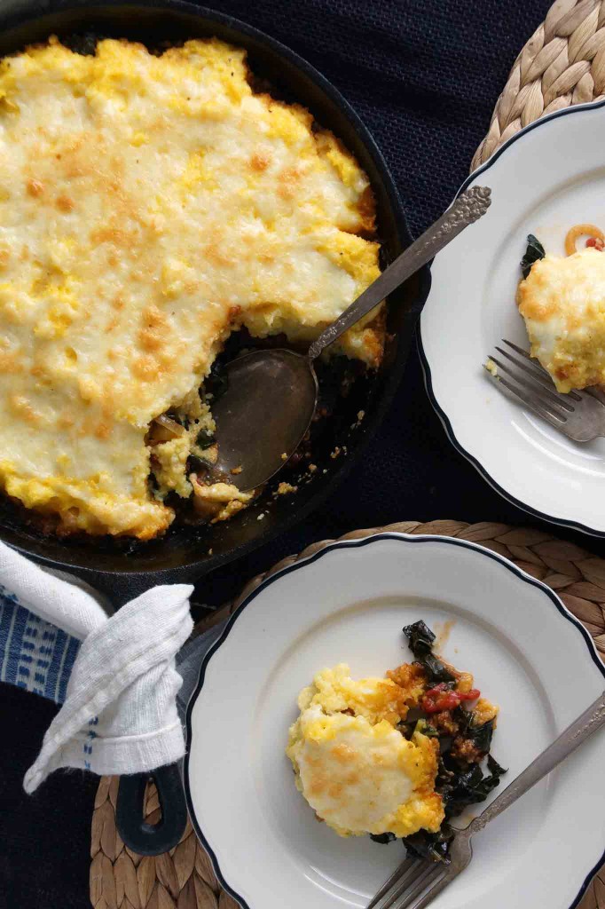 It’s an Italian take on a shepard’s pie. I made a saute of spicy sausage, kale, and tomatoes, topped it with a layer of polenta and a handful of grated cheese, and tossed it in the oven. The cheese bubbled and melted, the polenta got crispy-crunchy around the edges. It’s the kind of comfort food that’ll warm your heart, your soul, your stomach, and leave you barely even caring that you seem to be caught in the epicenter of that danged polar vortex.