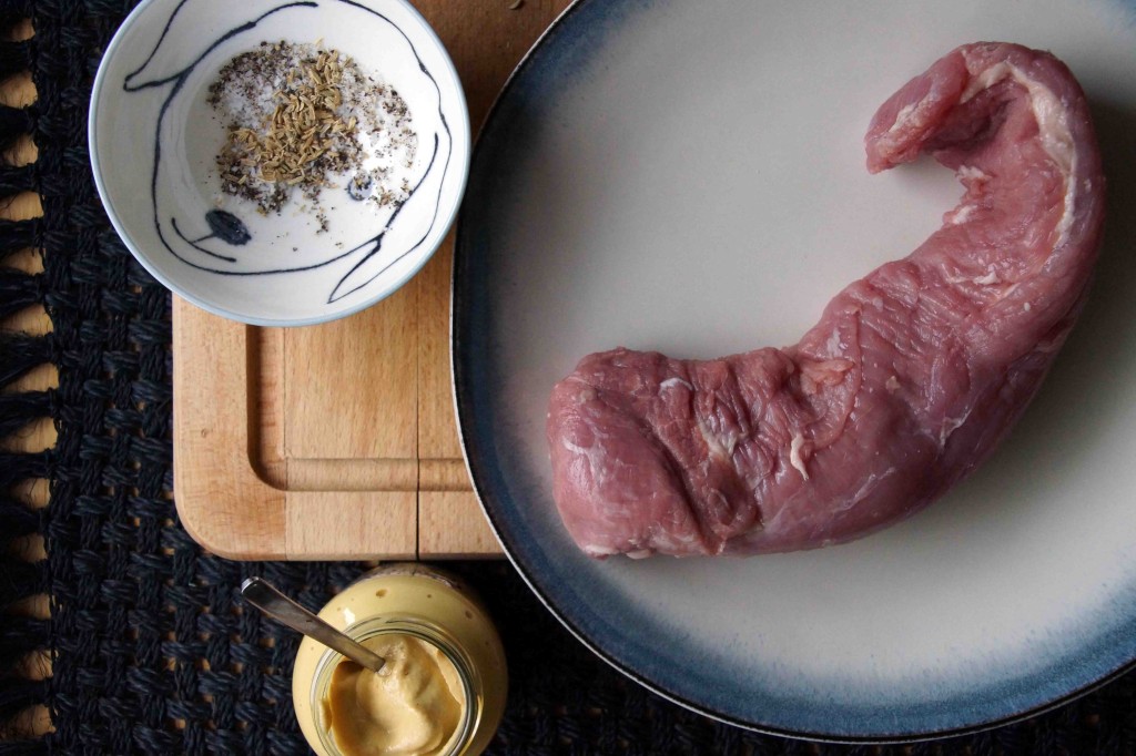 As your plums are nearing ready, get your pork cooking. We’ll rub the tenderloin with salt, pepper, and crushed fennel, then smear it with Dijon mustard. Sear it on the stove, then transfer to the oven to finish.