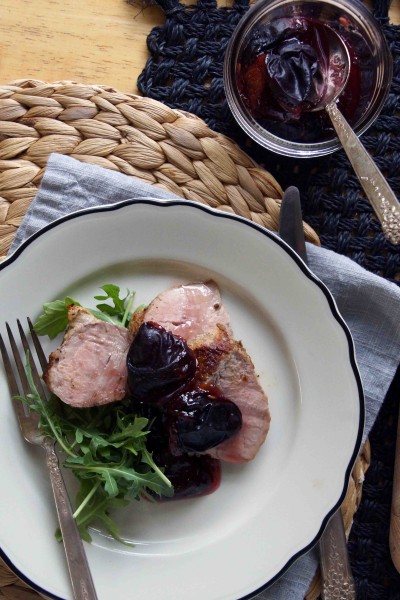 You’ve probably already picked up on this little tidbit about my taste buds, what with the recipes for pork chops with rhubarb & fig compote and the bacon & nectarine sandwiches: I have a mad weakness for pork paired with fruit. And on the subject of food weaknesses, I’ve got to mention Italian plums. This time of year, I just cannot get enough of them. I’ll throw back half a dozen just trying to get them home from the grocery store. I should really put my shopping bag in the trunk; the plums and baguettes would be much safer.