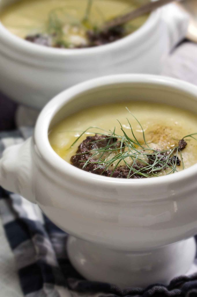 This is a good soup for chilly, rainy spring days. The fennel and leek flavors are light and cheery, the potatoes provide the thick, creamy texture that’s bound to bring you comfort when your surroundings are gray, and a dollop of black olive paste adds a punch of flavor.