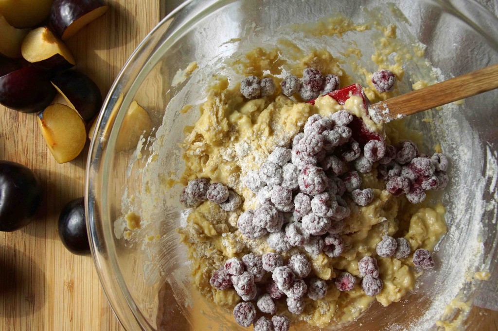 3. Pour the wet ingredients into the dry ingredients and quickly combine until just combined. Gently fold in the raspberries in 2 additions. Transfer the batter to the prepared pan and spread evenly. Arrange the quartered plums in the batter, skin-side up.