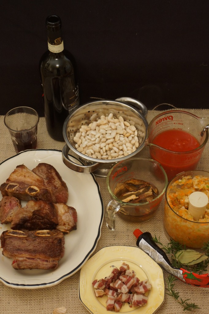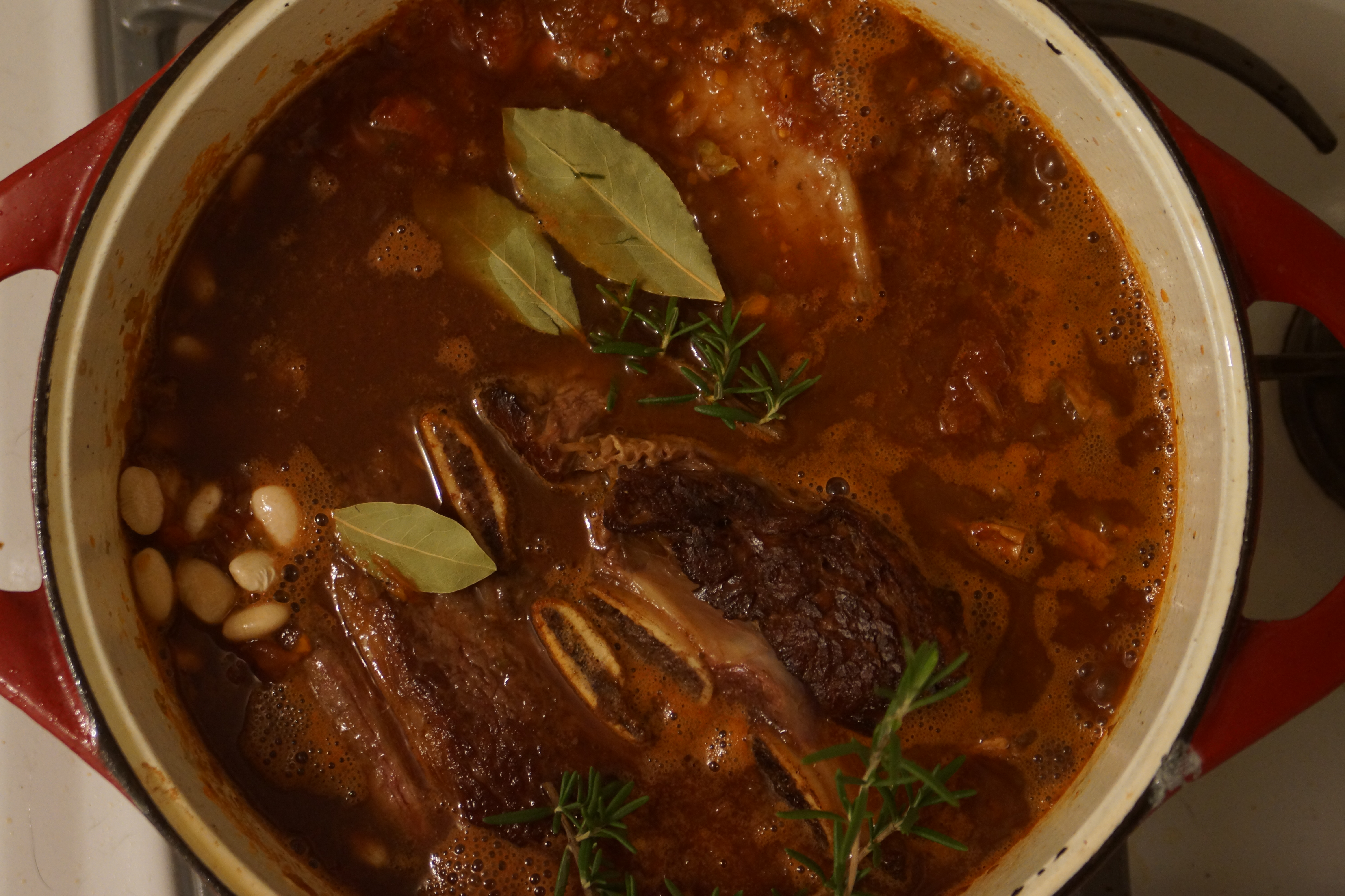 Example: Instead of going out on the town and cutting loose this past Saturday night, I found myself at home, dressed for comfort, braising beef short ribs and cannellini beans.