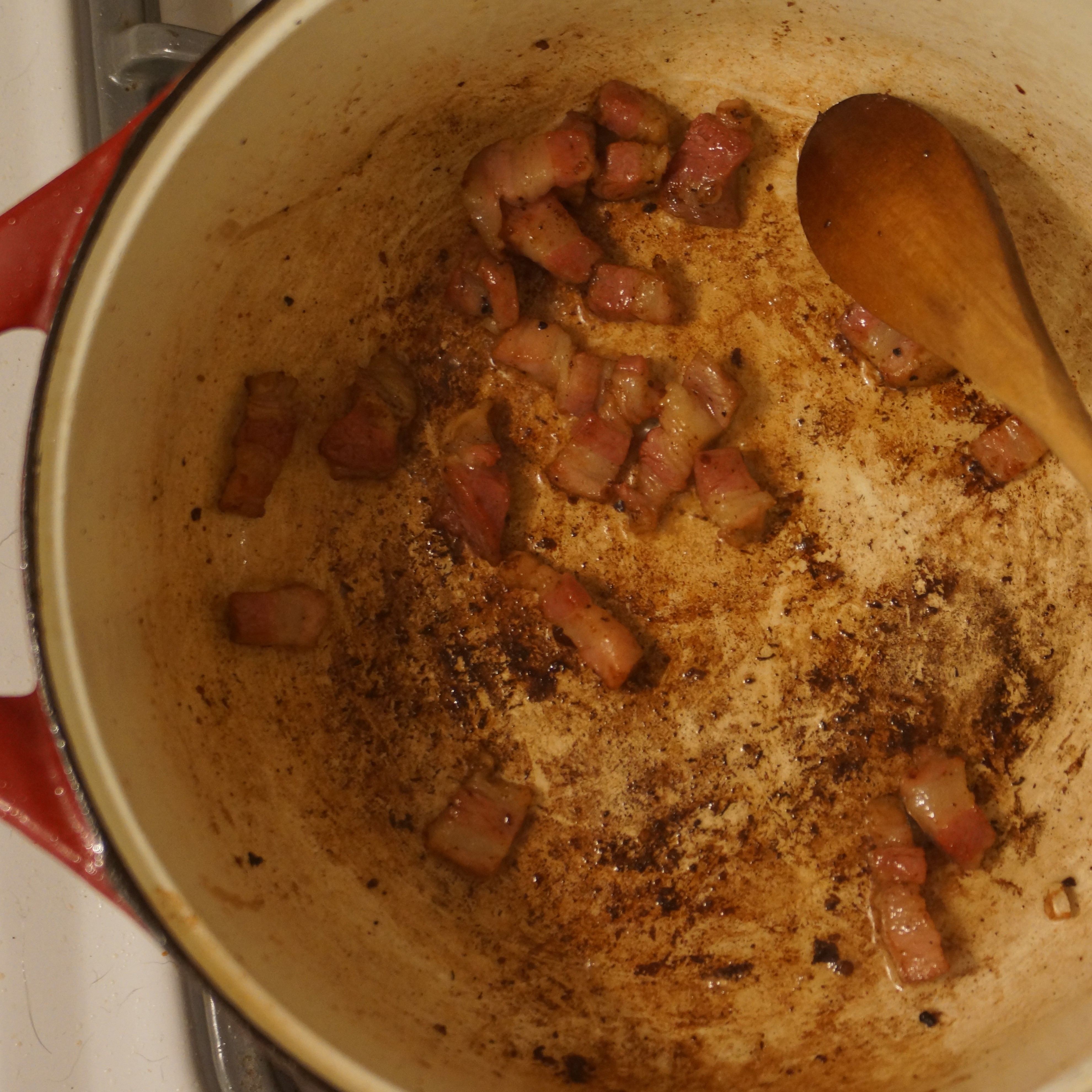 Crisp the pancetta, sweat the veggies, and caramelize a dab of tomato paste. Add tomatoes, the porcini with their bathwater, beans, and red wine.