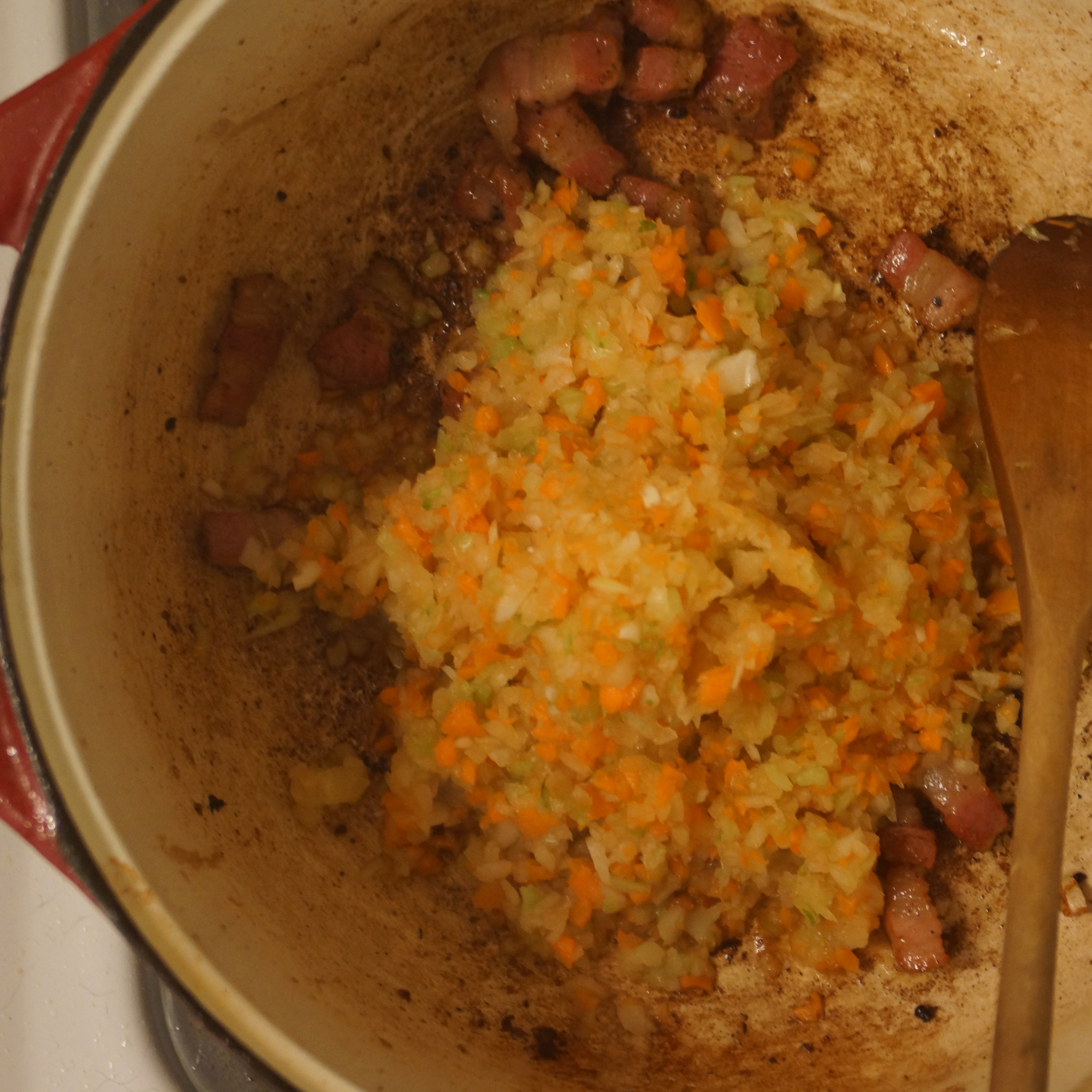 - In the same pot that you browned the meat, add pancetta and saute until crisp. Add the pestata and saute until the vegetables take on a bit of color and release moisture, 3-5 minutes. Clear a small spot in the pot, add the tomato paste, allow to caramelize briefly before stirring into the browned pestata. Add porcini and soaking liquid, crushed tomatoes, red wine, bay leaves and rosemary. Add beans and short ribs, add water to cover. Let it come up to a boiling point and reduce heat to a very slow simmer.