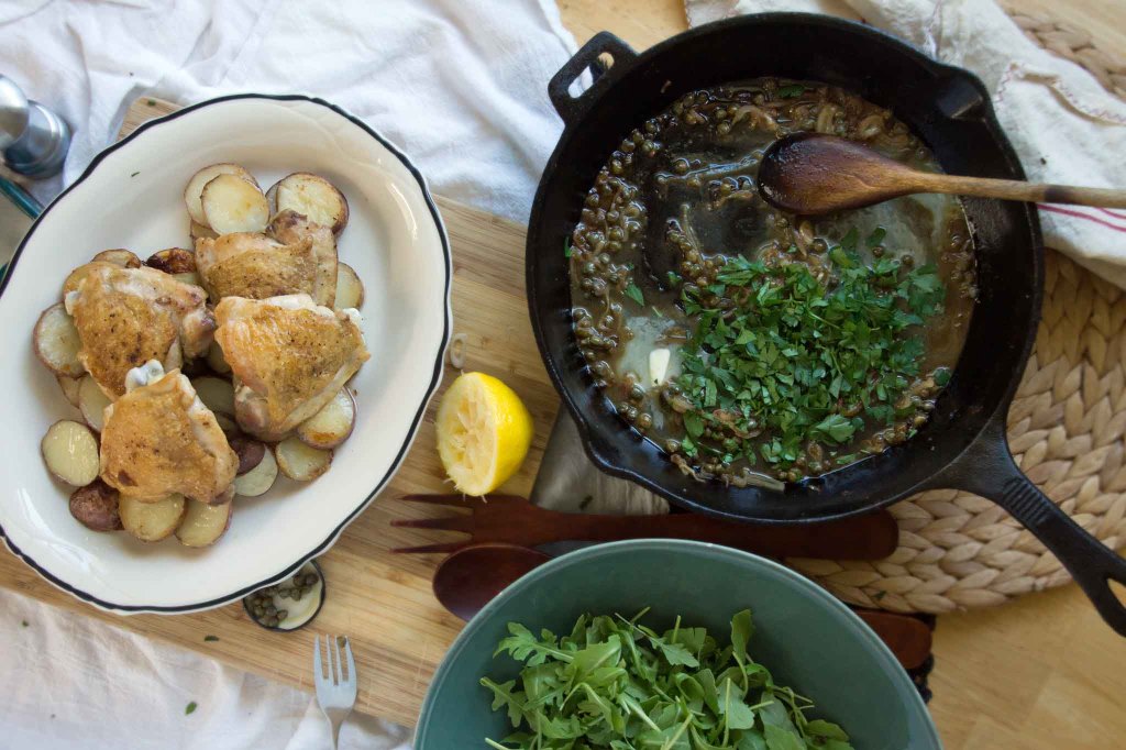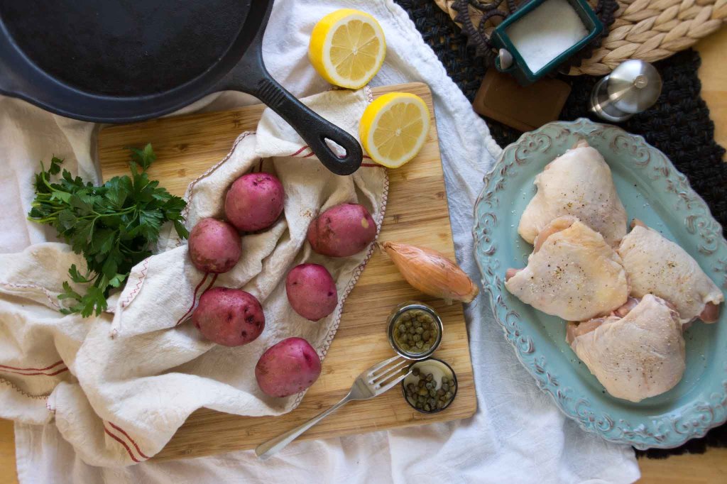 The ingredients list is short and basic for cozy, simple food. You’ll just need chicken thighs, a few red potatoes, a shallot, lemon, capers, and parsley.