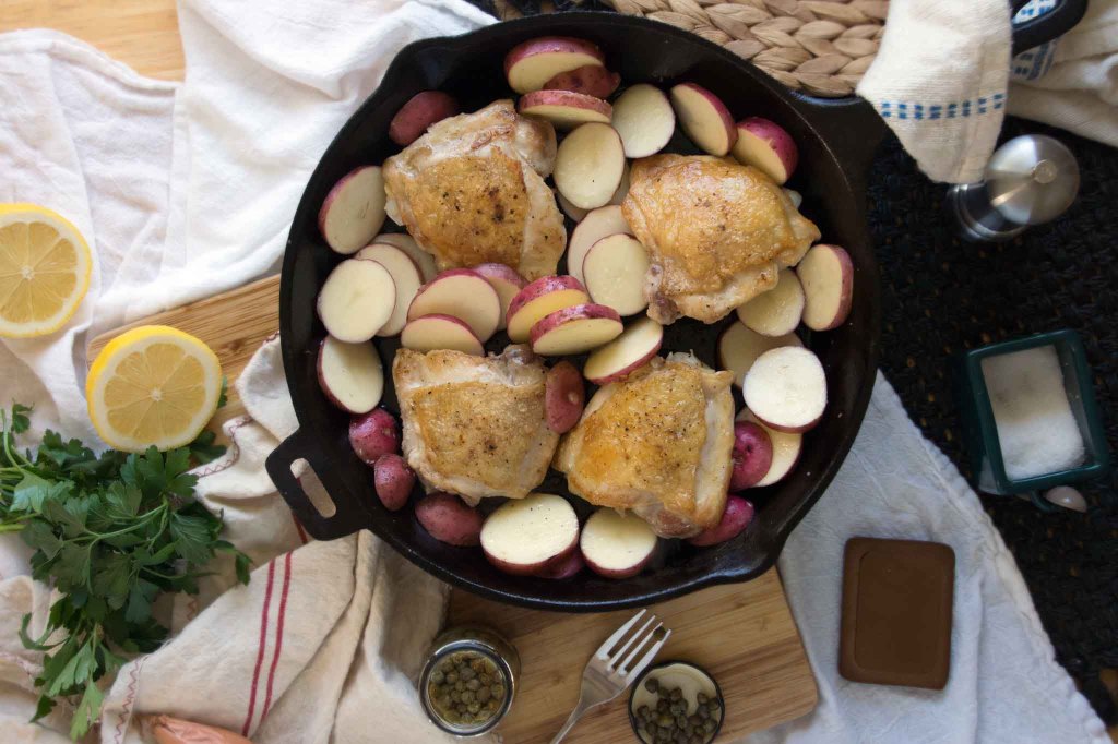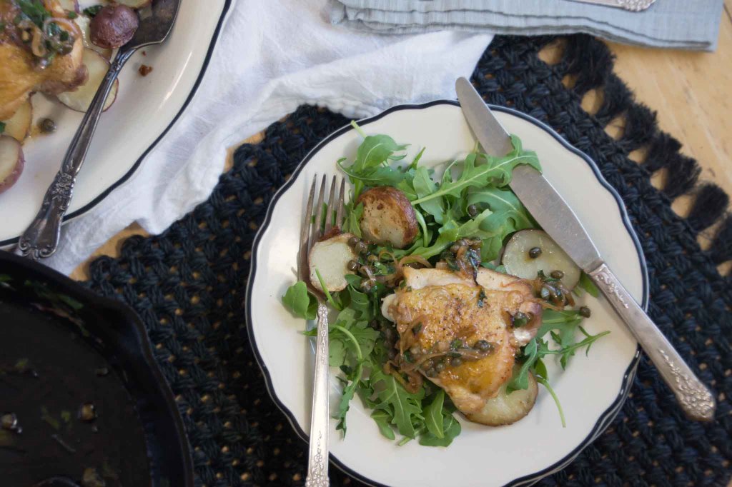 - Transfer the chicken and potatoes to a warm platter and loosely tent with foil. Place the pan back on the stove, over medium-high heat, and add the sliced shallot. Saute, scraping up any little bits that might be stuck to the pan, until the shallot is translucent, 1-2 minutes. Add the capers, lemon juice, and about 3 Tbsp. water and simmer for a minute, allowing the liquid to reduce and the flavors to blend. Remove from the heat and stir in the butter. Finally, stir in the parsley and season as needed with salt and freshly ground black pepper. Pour the sauce over the chicken and potatoes and serve.