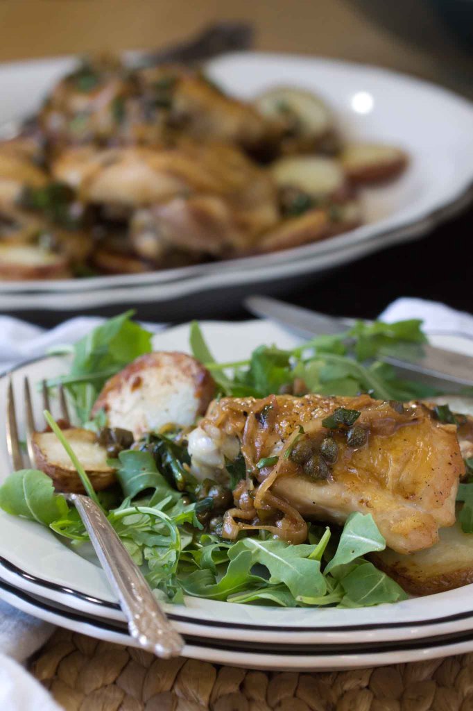 Spoon the caper and lemon sauce over the chicken and potatoes and dinner is ready. I served mine over heap of arugula to cut the richness and add a peppery bite. I ate and thought about the words I’d use to describe my dinner: easy, inexpensive, comforting, totally delicious, and definitely bound to become a staple at my table this fall and winter.
