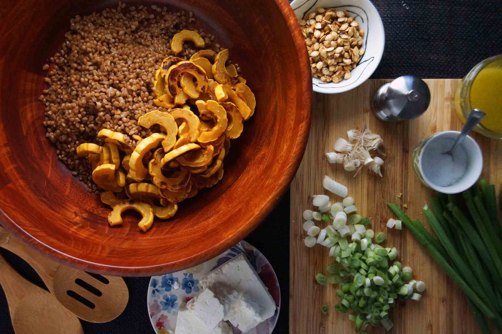 Delicata Squash and Wheat Berry Salad with Feta and Scallions
