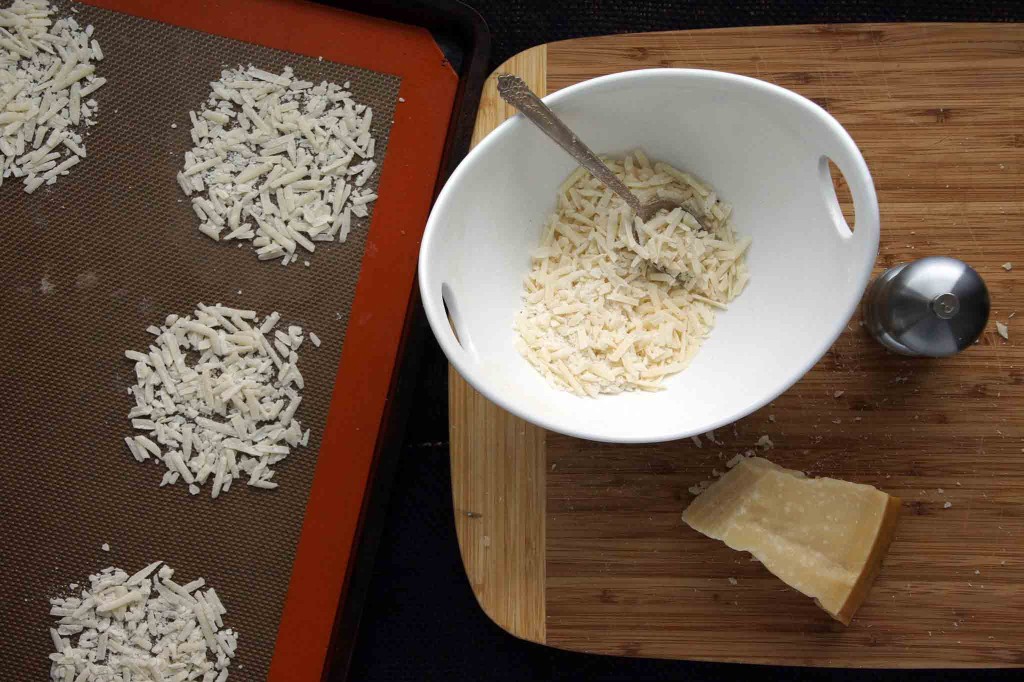 - While the garlic is roasting, make the Parmesan frico. Line a baking sheet with parchment paper or a silpat. Combine the coarsely grated Parmesan, flour, and a few twists of black pepper in a small bowl. Using about 1 Tbsp. of the Parmesan mixture at a time, create a 3” circle on the lined baking sheet. Don’t worry if there are a few holes in the circles—they’ll fill in as the cheese melts. Bake until the cheese is golden, about 6 minutes. Cool for a minute on the pan, then transfer to a wire rack to cool completely. Be careful, as they are quite delicate.