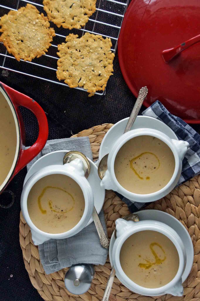 While the garlic is roasting, make the frico. A frico is a crisp little cracker made from melted Parmesan cheese. The Parmesan takes on a different flavor as it melts, becoming nutty and little tangy. They are good on their own just to munch, but I love using them like I am here to add another dimension to a simple soup. Grate a pile of Parmesan using the big holes on a box grater. Toss the cheese with a spoonful of flour and a few twists of pepper, then spread into circles on a lined baking sheet. Bake for a few minutes until the cheese bubbles and melts, turns gold, and fuses together to make a cracker. Pull them out of the oven, let them cool and set up for a moment, then transfer them to a wire rack to finish cooling. Side note–make sure your dog is nowhere near. Why do I feel the need to mention this tidbit? I’m sure you can guess.