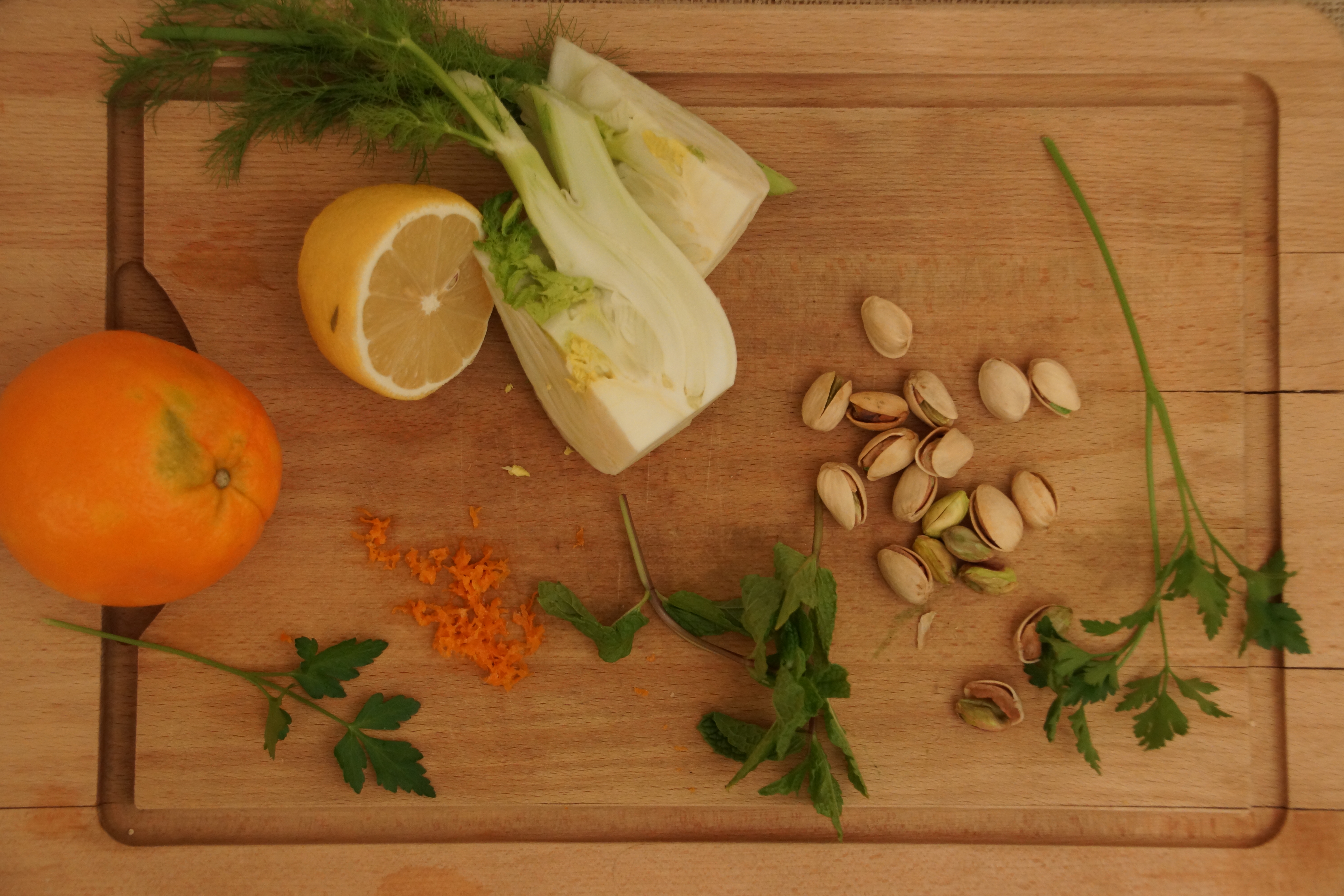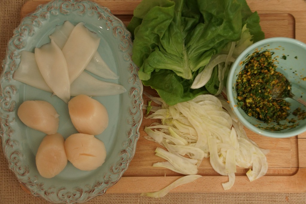 Chop the nuts, zest the orange, mince the mint and parsley.  Toss it with a touch of lemon juice and a splash of olive oil.  Your super fresh-tasting gremolata is done.  Shave the fennel, wash the lettuce, pat the squid and scallops dry.  Almost there.