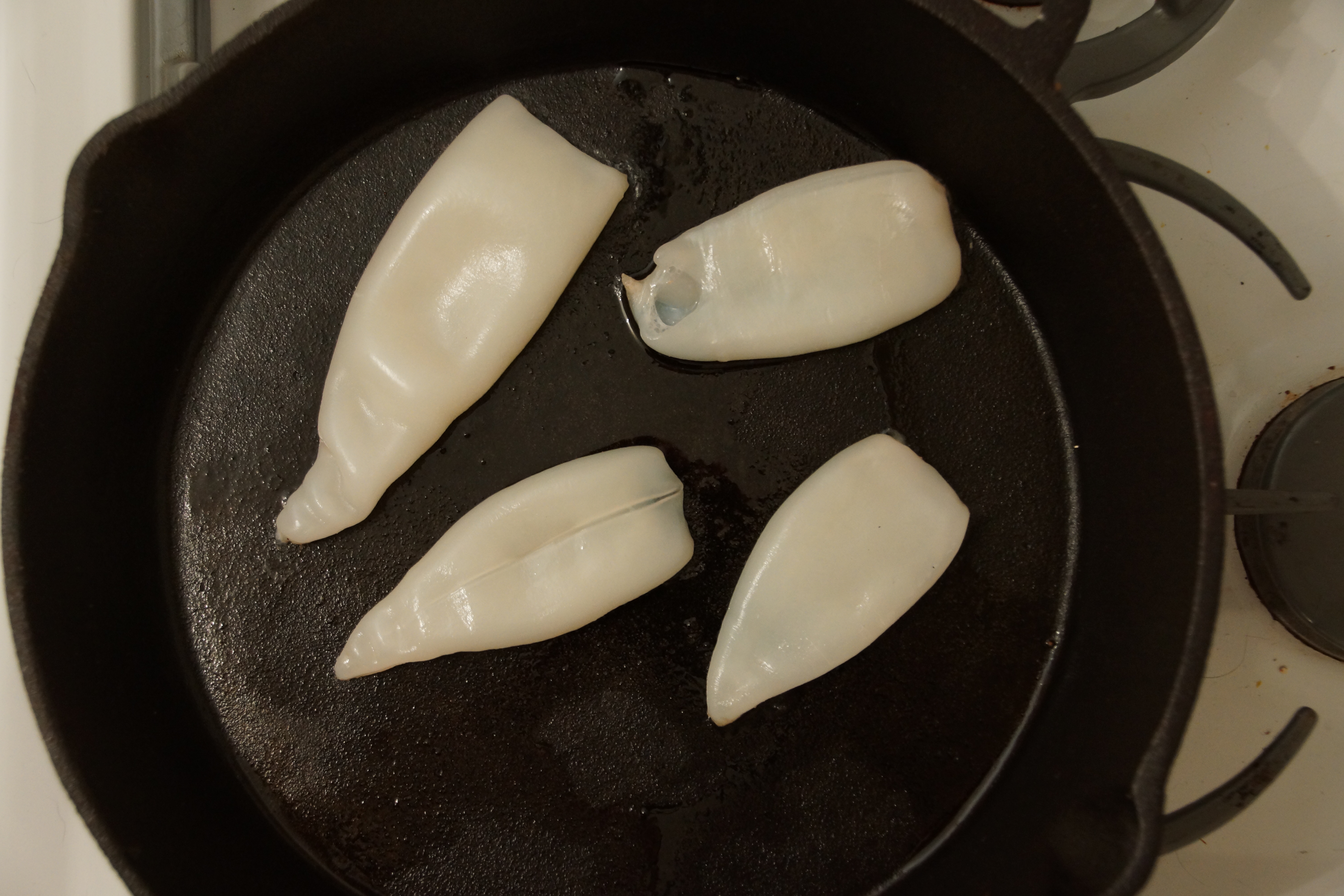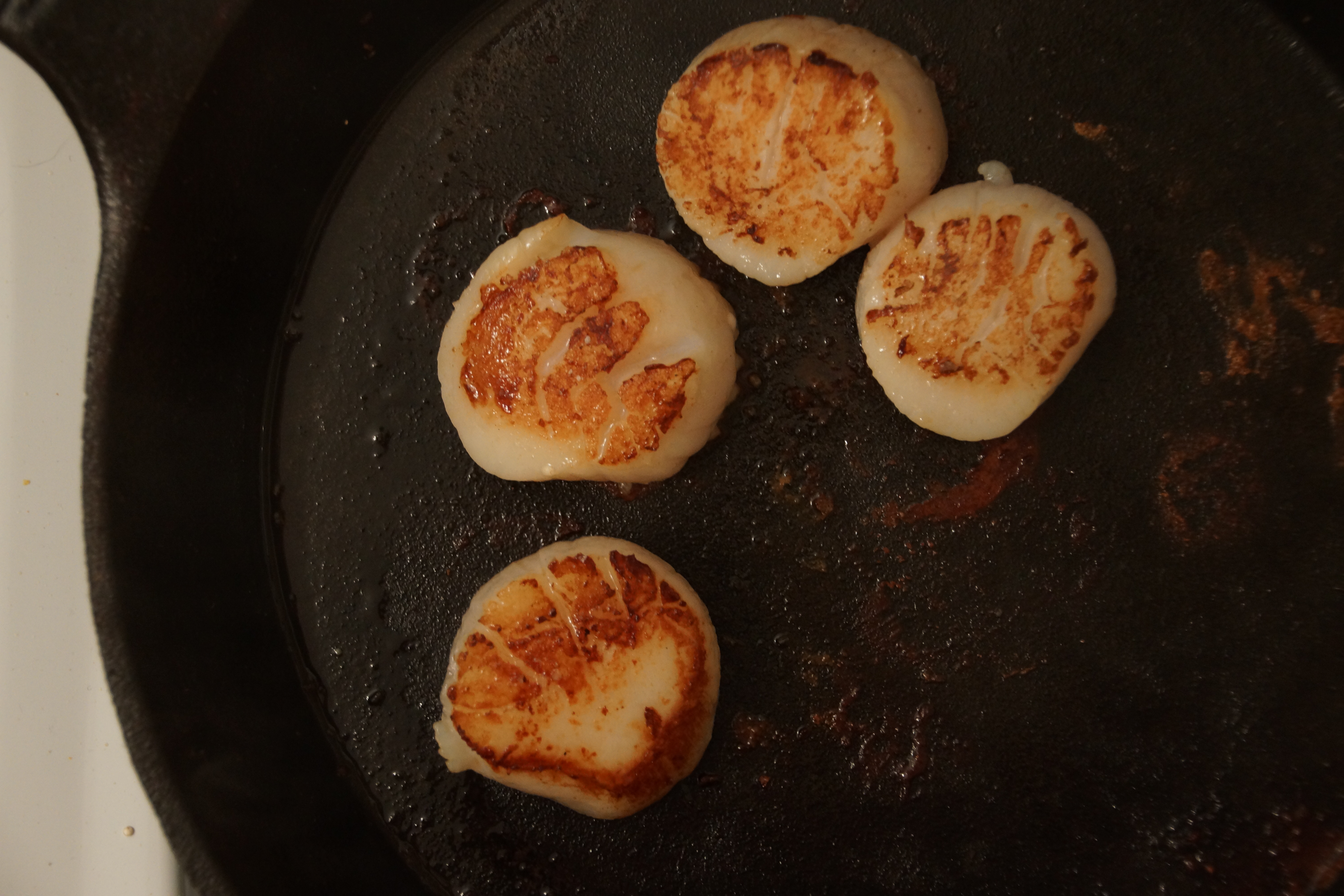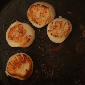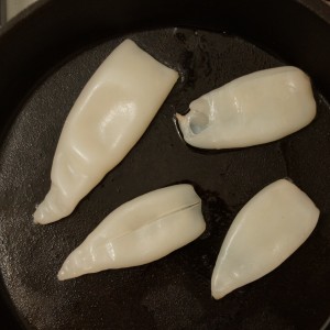 Seafood gets a quick sear.  Calamari tubes first- then cut them into rings while scallops are in the hot seat.
