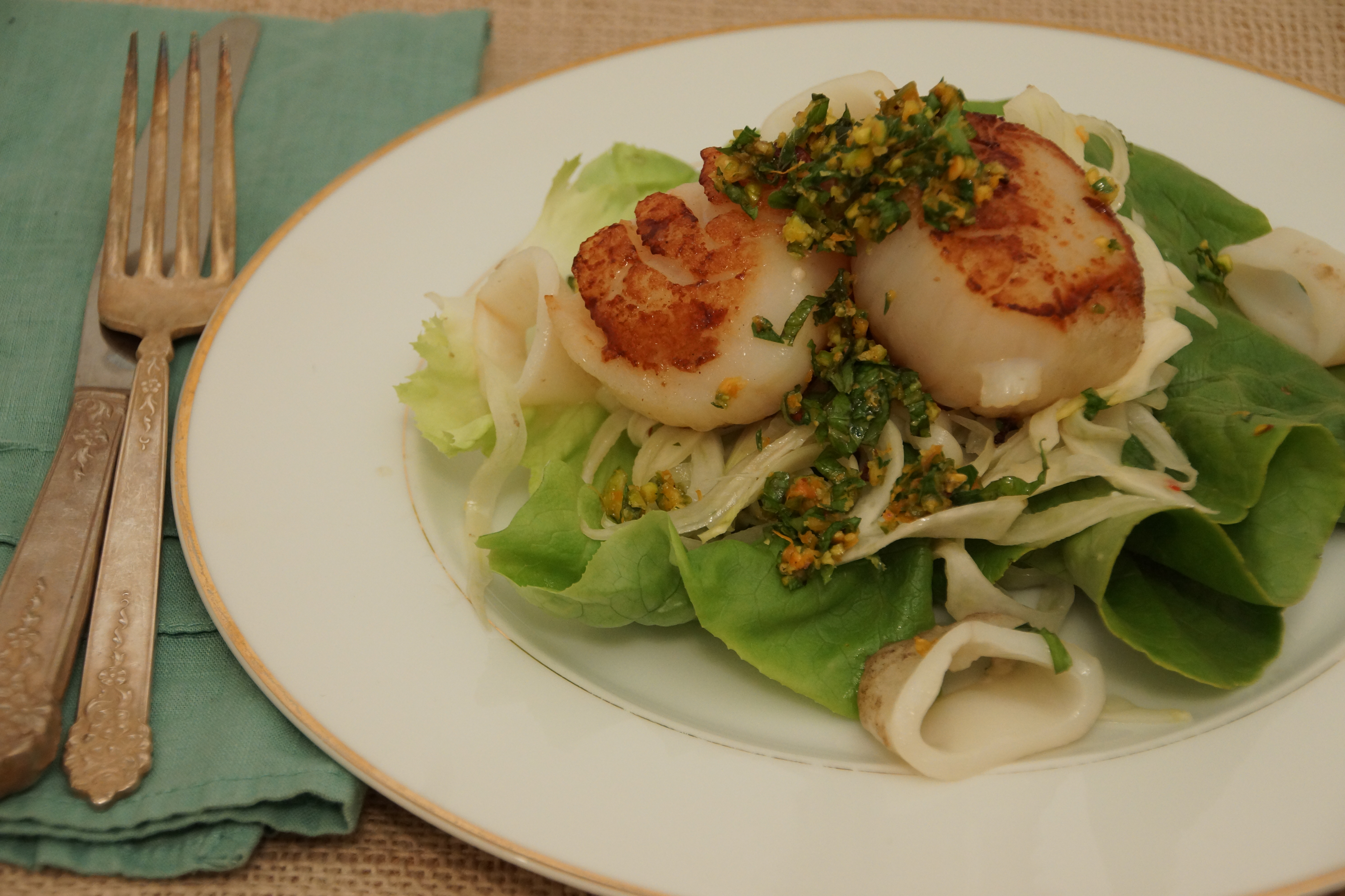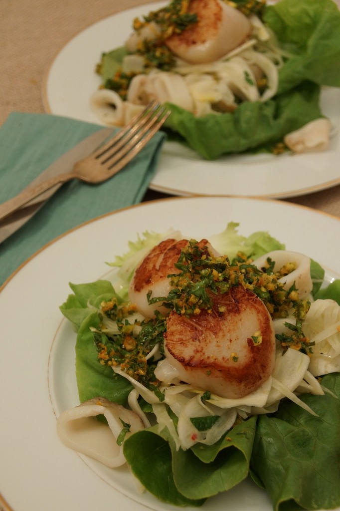 Plate it up.  Bibb lettuce base, calamari rings tossed with the shaved fennel, seared scallops as the star. Top it with the gremolata and there you go.  Birthday dinner for a recovering meat-aholic.