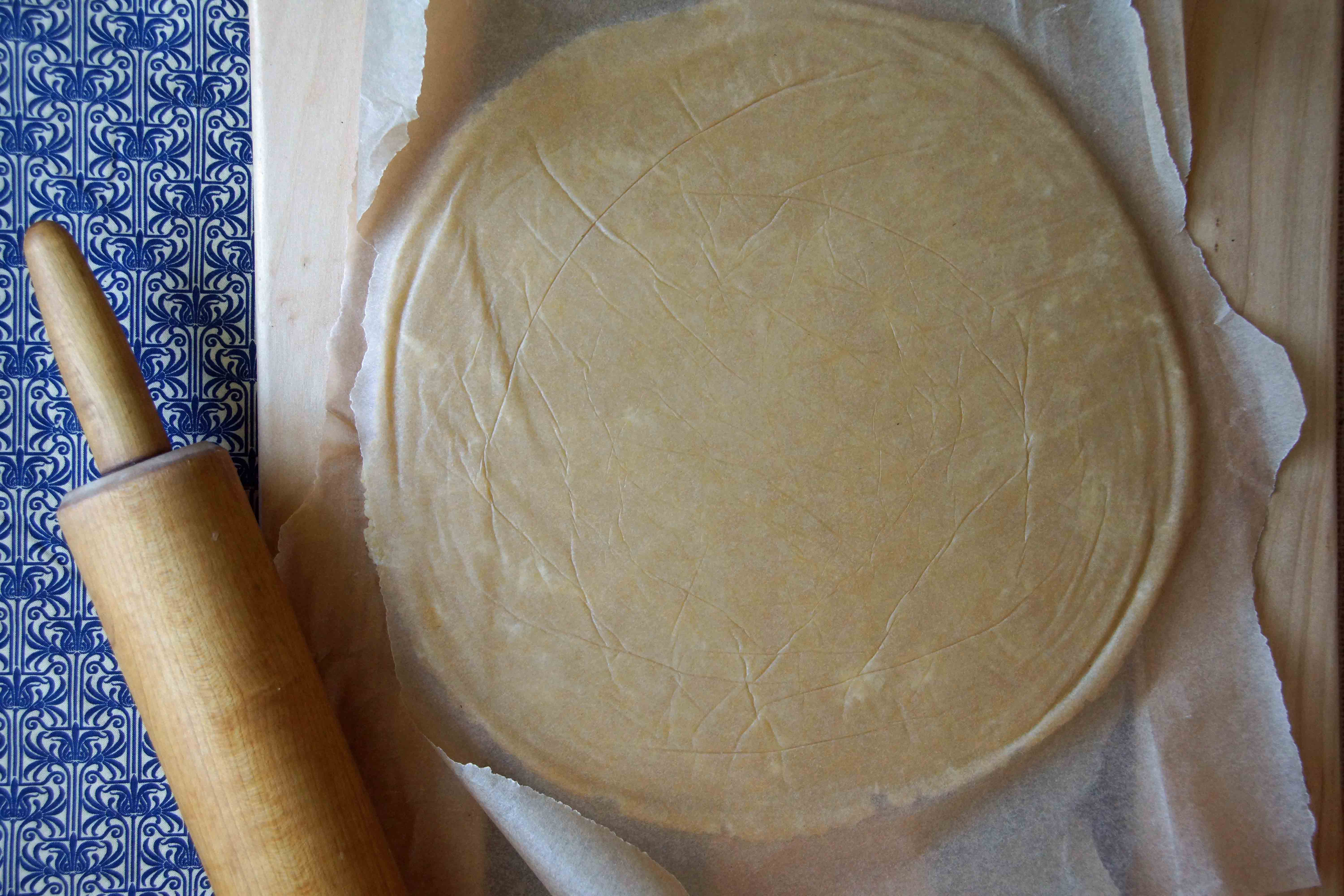 - Roll the dough between 2 sheets of parchment or waxed paper into an 11 in. circle. Remove 1 piece of paper and flip the dough into a 9 in. tart pan with removable bottom. Remove the top piece of paper and firmly press the dough into the pan, evening the edges and patching, as needed. Place the tart shell in the refrigerator while you prepare the filling.