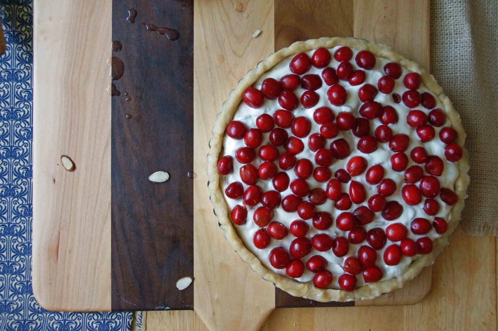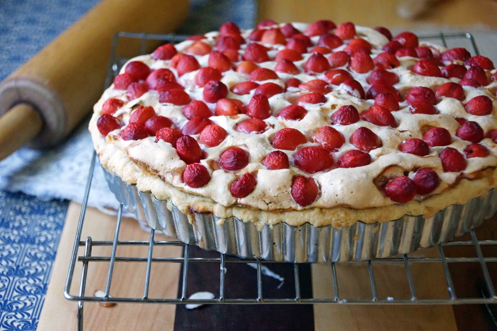 - Evenly spread the almond meringue in the chilled tart shell. Scatter the cherries over the top of the meringue and gently press with your palm so they'll stay put as the meringue rises. Bake on the heated pizza stone until the meringue is lightly golden and set, 45-50 minutes. Cool completely on a rack before serving.