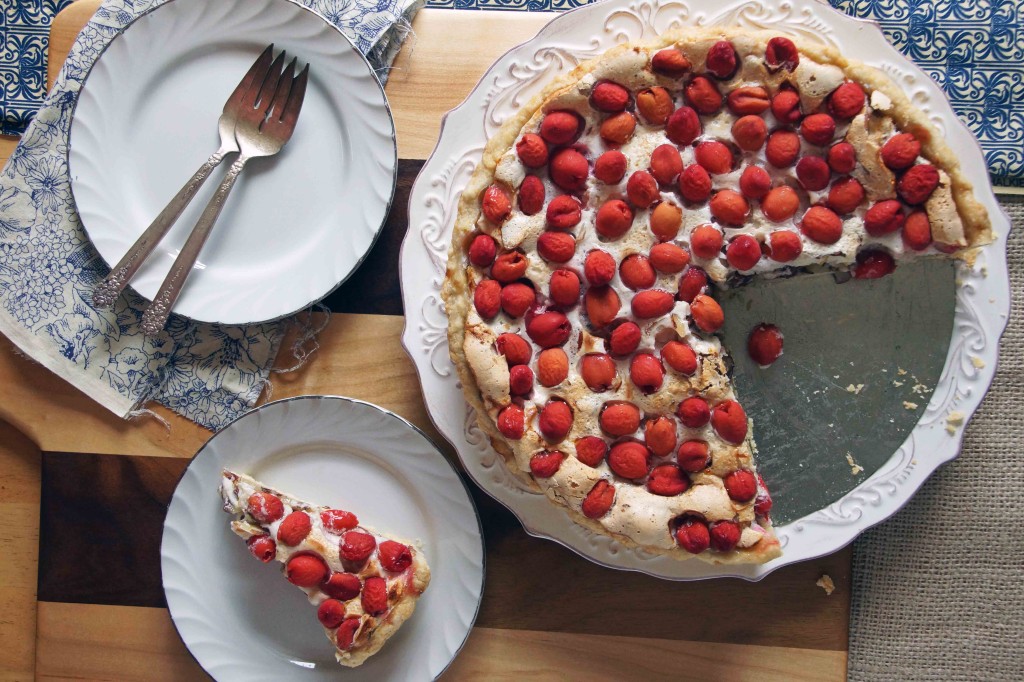 Time to break out the cherries! Scatter them over the meringue or if you’re feeling like a perfectionist, swirl them into a pretty spiral. Pop the tart into the oven where it will rise and brown into something of true beauty.