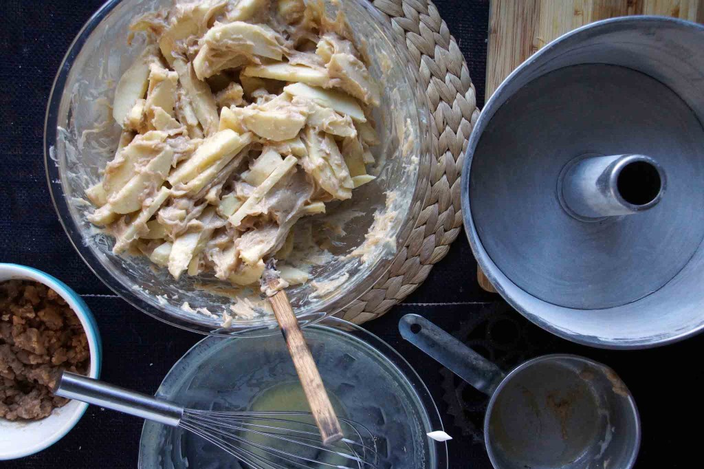 Dollop the apple-laden cake batter into a greased tube pan and top with the brown sugar crumbles. No snitching! I mean, not too much snitching! Bake.