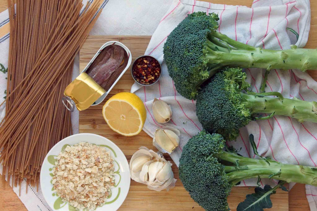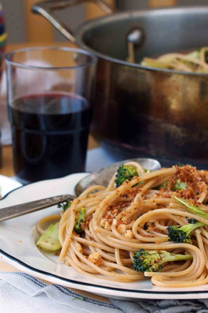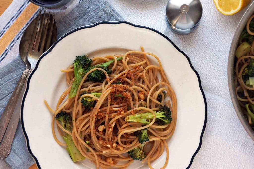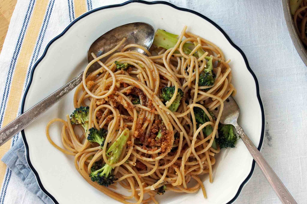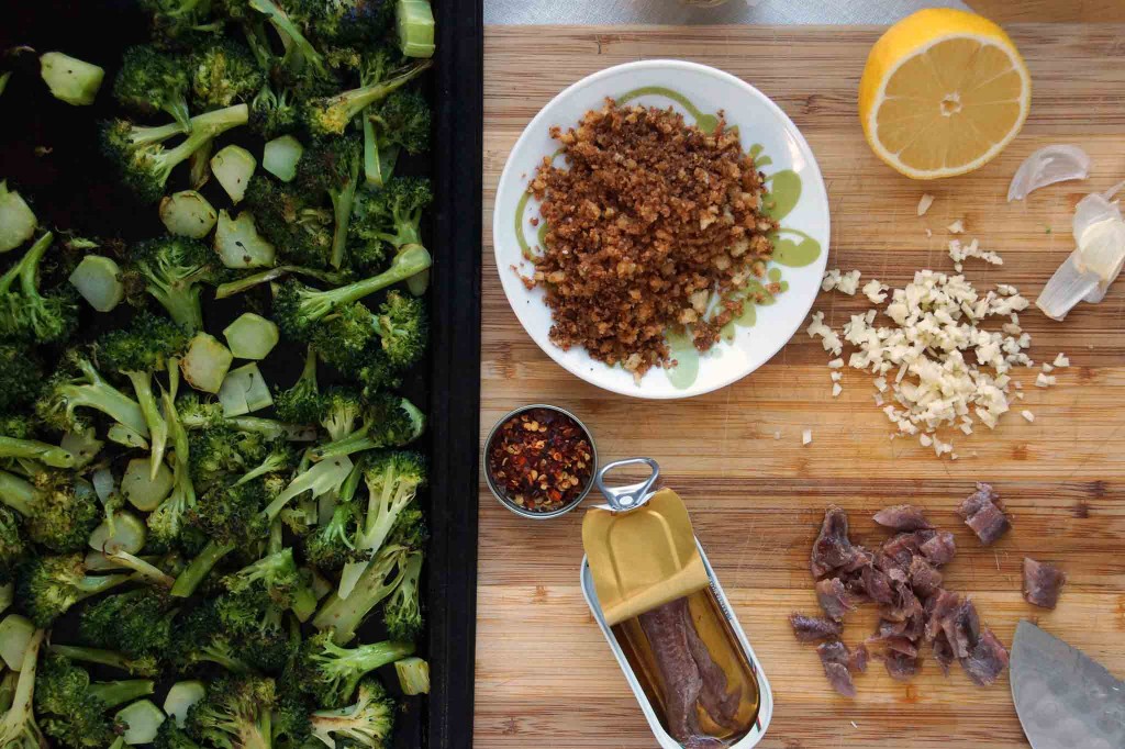 - Heat about 1 Tbsp. olive oil in a large skillet over high heat. When the oil starts to shimmer, add the breadcrumbs and fry until they’re golden and toasty, 1-2 minutes. Transfer to a small plate or bowl and wipe out the pan with a paper towel. Add a Tbsp. of oil to the pan and return to medium-high heat. Add the anchovies, garlic, and red pepper flakes and sauté until the garlic is golden and fragrant and the anchovies have more or less melted into the oil, 1-2 minutes. Add about ¼ c. of the pasta water to the pan to loosen up the mixture. The broccoli should be ready by now. Add it to the pan, toss to coat.