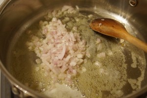 - Add minced shallots, season with salt, and saute until translucent.