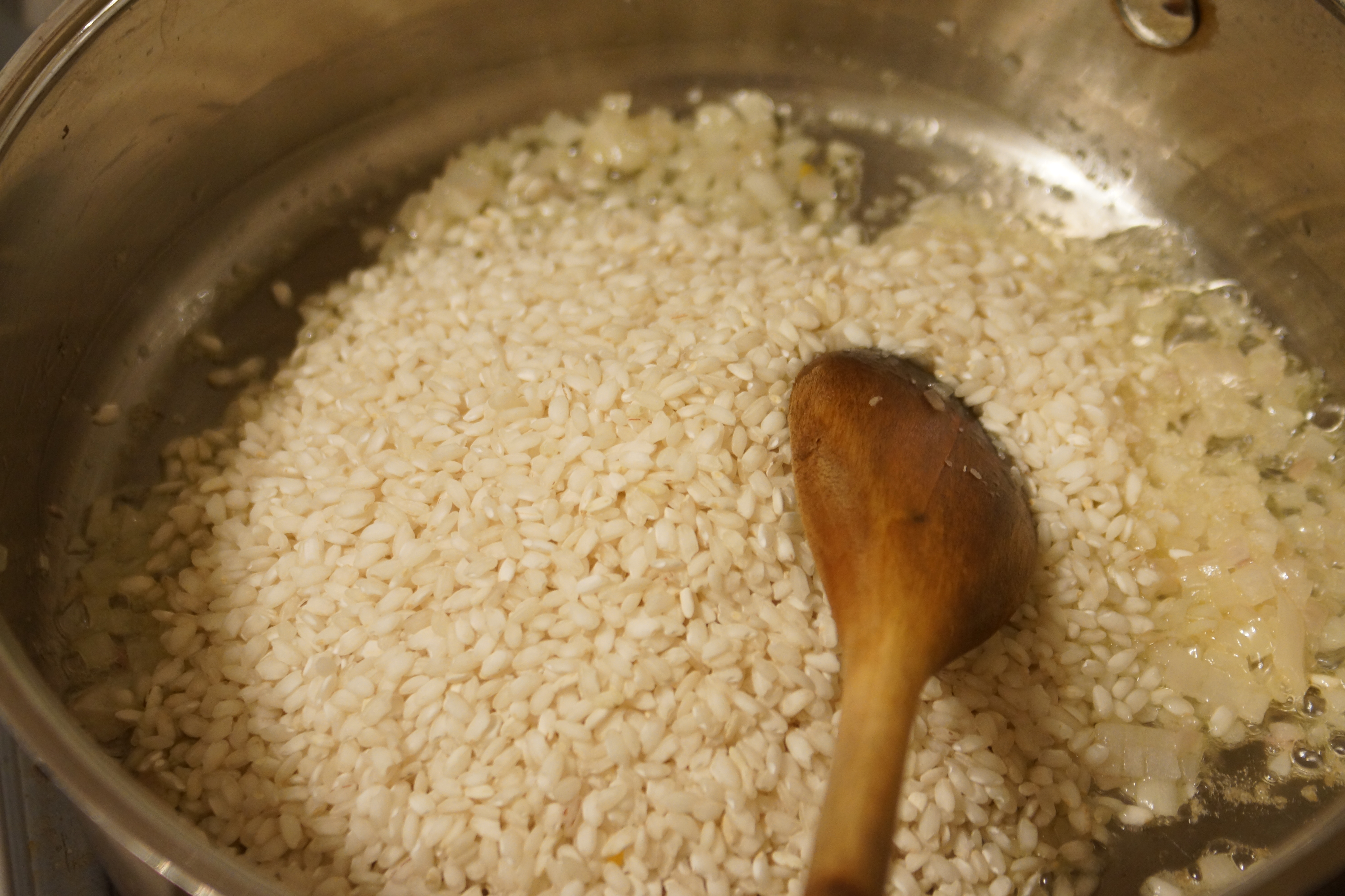 - Add wine and allow rice to absorb.