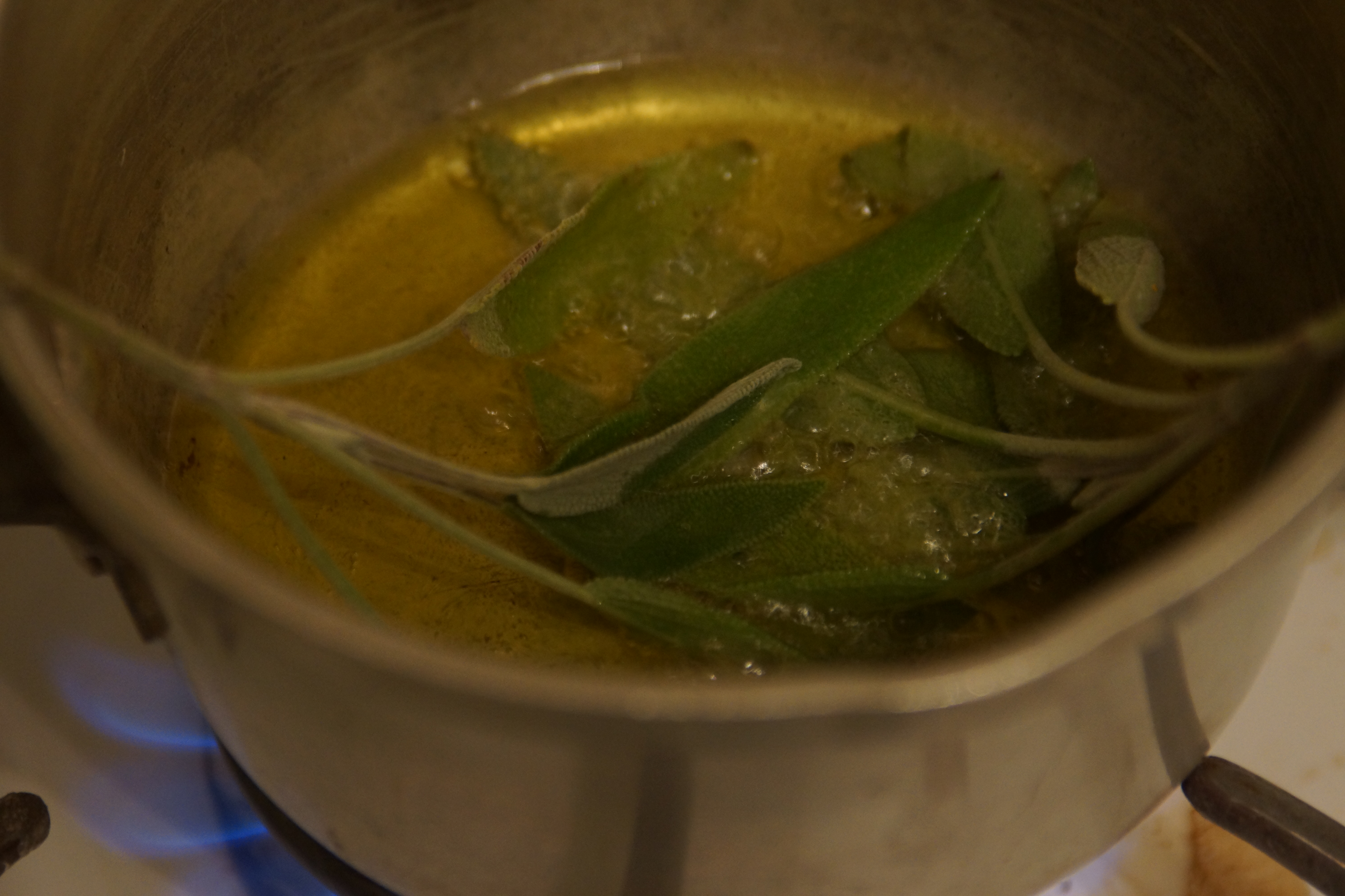 - Meanwhile, heat remaining olive oil in small sauce pan and fry sage leaves until crisp and fragrant. Removes leaves and sprinkle with salt, reserve oil.