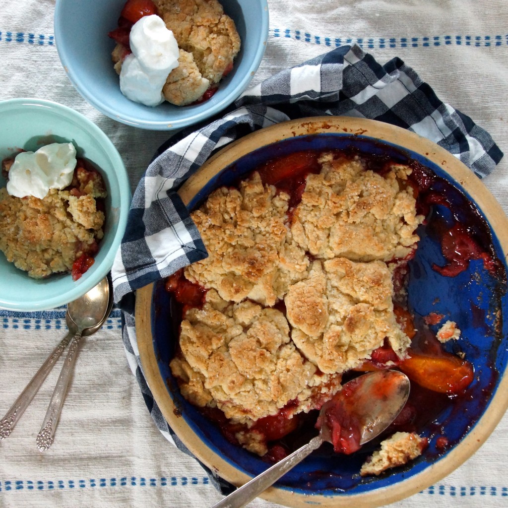 Here’s a good one: warm, just-sweet-enough baked apricots and strawberries, with a rich biscuit topping, dolloped with a spoonful of whipped cream. Ahhhh…it was my first cobbler of the season and I was taken aback by how much I enjoyed it. Over the winter, you forget just how good ripe stone fruits and berries are. Then you encounter a display of fruit you haven’t seen in almost a year, throw together a cobbler, and quickly remember.