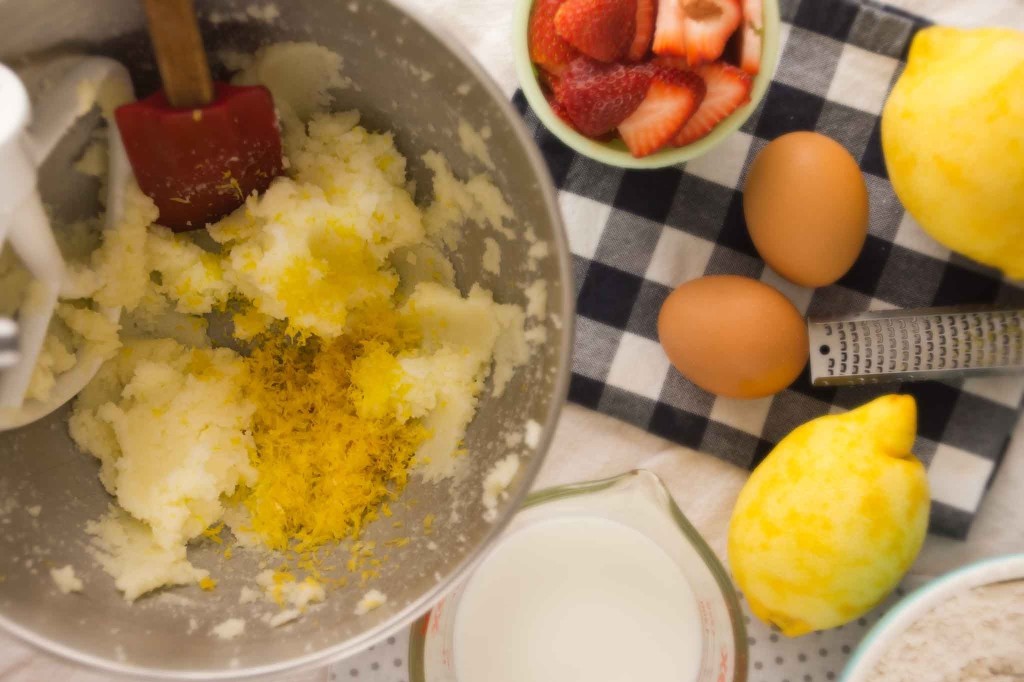 To make the strawberry cake, we’ll start by creaming butter and sugar, then we’ll beat in a couple of eggs and the zest of a lemon.
