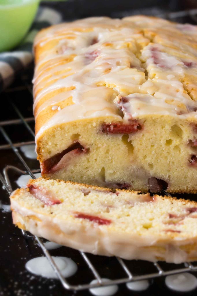 - Using a rubber spatula, gently fold the strawberries into the batter. Transfer the cake batter to the prepared loaf pan and smooth the top with your spatula. Bake until a tester inserted in the center of the cake comes out clean, about 1 hour. Allow to cool for a few minutes in the pan, then remove and cool completely on a wire rack.