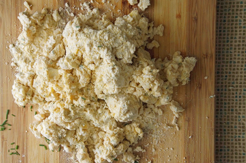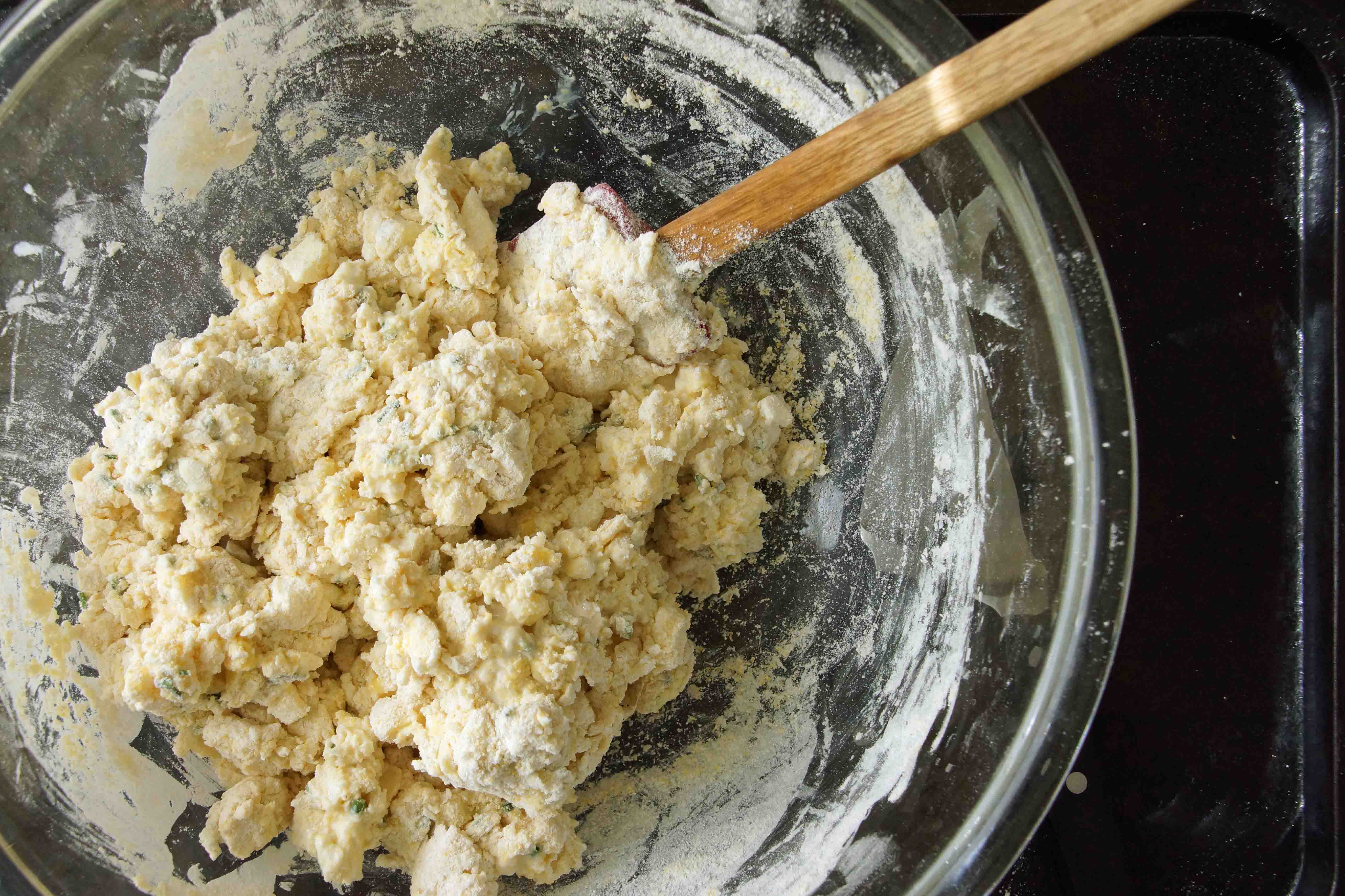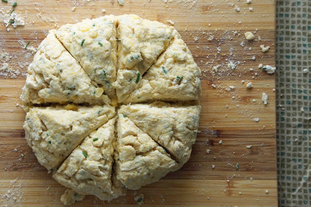 - Add the corn, chives, and buttermilk and quickly stir together with a rubber spatula until the mixture just begins to come together. Dump the floury pieces of dough onto a countertop or board and quickly knead to form a cohesive mass. Divide the dough in 8 pieces and quickly roll into a ball. Place the dough balls on the baking sheet and bake until lightly golden 15-16 minutes. Serve warm.