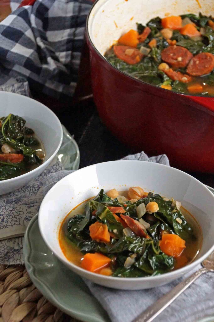 - Pour in enough stock to cover the sweet potatoes, chickpeas, and chorizo by about an inch. Bring to a boil, then reduce to a simmer. Simmer, partially covered, until the potatoes are nearly tender, 8-10 minutes. Add the kale, simmer for 5 minutes, then add the spinach and simmer until tender, about 2 minutes. Taste. Season, if needed, with salt and pepper.