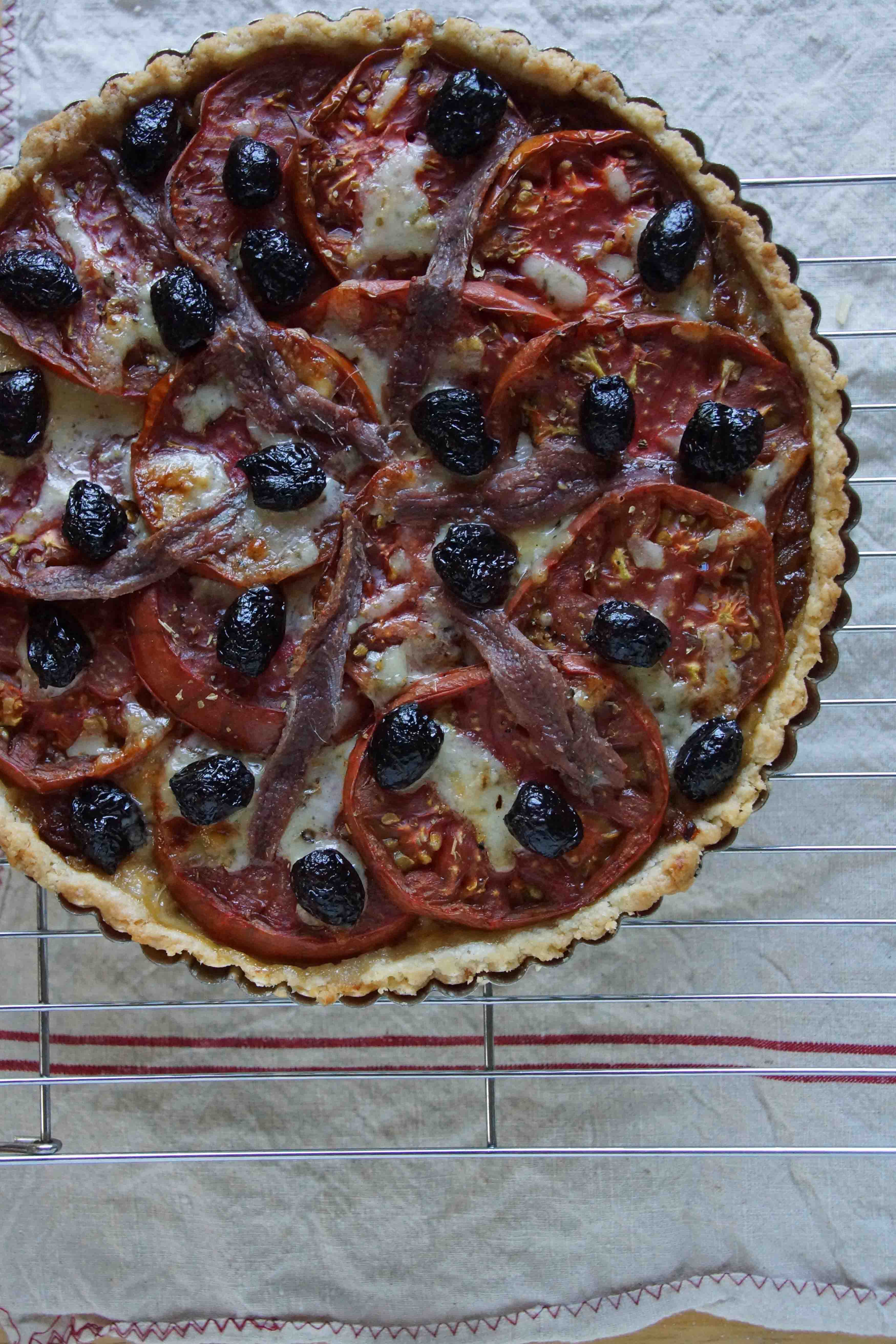 When the tart shell is chilled and the onions have cooled down, you’re ready to assemble the tart. Sprinkle the bottom of the crust with a bit of grated Italian fontina, then spread on the onions. Add a little more cheese and cover with thick slices of tomato. Season the tomatoes with a pinch of oregano and a few twists of black pepper. Top the tomatoes with what’s left of the cheese, then scatter a handful of black olives and arrange a few anchovy fillets on top.